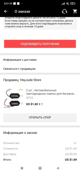 Товар пришел на половину,вместо двух одна единица. товар нормальный,возможно закажу еще. Продавец обещал вернуть деньги . Сумма небольшая,поэтому спор не открываю.
