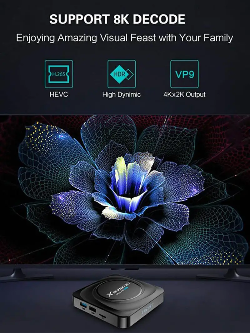 Описание: ТВ-приставка X88 PRO 20 smart android может изменить ваш традиционный телевизор и ЖК-монитор в мультимедийный центр, подключив интернет (через WiFi или RJ45).Эта умная ТВ-приставка android принесет вам много удовольствия и удобства с ее мощной функцией, 8K видео аппаратное декодирование, 2,4G/5G двухдиапазонный WiFi, BT4.2 и 1000M LAN.Просто подключите его к телевизору, и вы готовы к работе. Преимущество: на базе новейшей ОС Android 11,0, которая работает лучше и стабильнее, чем Android 10,0, а также с большим количеством функций и оптимизаций.Особенности: приведенный в действие RK3566 64-разрядным четырёхъядерным Cortex-A55 Процессор. Он также оснащен Android 11,0, HD 2.0a до 4K выходом и Mali-G52 2EE GPU.Два типа на выбор: 8 Гб ОЗУ + 64 Гб ПЗУ/8 ГБ ОЗУ + 128 Гб ПЗУ, что обеспечивает множество возможностей для высокоскоростной обработки данных и хранения.HD: мощное декодирование H.265 и VP9 может сэкономить около 50% полосы пропускания. Вы можете смотреть фильмы 4K при сверхвысоком разрешении и плавном воспроизведении видео.WIFI: 2,4G/5G двухдиапазонный WiFi и 1000M LAN обеспечивают надежный доступ к сети с высокой скоростью передачи данных. BT4.2 позволяет телевизору быстро подключаться к устройствам с поддержкой BT. Характеристики: Название товара: ТВ-бокс Цвет: черныйТип дополнительно: ЕС 8 ГБ + 64 Гб/ЕС 8 ГБ + 128 ГБ Процессор: RK3566 четырехъядерный 64 бит Cortex-A55Графический процессор: Mali-G52-2EEO.S: Android 11,0, последняя Android телеприставка, более стабильная, безопасная и более ЭнергоэффективнаяПамять: RAM 4G/8G ROM 32G/64G/128GWiFi: IEEE 802,11 a/b/g/n/ac, 2,4G/5G WiFiUSB: 1 Высокоскоростной USB 3,0, 1 USB 2,0Поддержка BT: BT4.2LAN: Ethernet: Стандартный RJ-45 10/100/1000HDMI-Совместимость: HDMI-Совместимость 2.0a до 4K 60Расширенное хранилище: Поддержка tf-карты (до 64 ГБ)Мышь/клавиатура: Поддержка мыши и клавиатуры через USB; Поддержка беспроводной мыши и клавиатуры 2,4G через usb-ключ 2,4GЯзык: английский, французский, немецкий, испанский, итальянский и т. Д.Форматы декодера: H.265 HEVC/MVC Main10 профиль yuv420 L5.1 до 4096x2304 60fps, H.264 AVC/MVC Main10 профиль yuv400/yuv420/yuv422/L5.1 до 4096x2304 60fps, VP9 Profile0/2 yuv420 L5.1 до 4096x2304 60fps, VP8 verision2, до 1920x1088 60fps, VC1 MPEG-4 MPEG-2 MPEG-1 до 1920x1088 60fps.Формат Мультимедиа: Avi, Ts, Vob, Mkv, Mov, ISO, wmv, asf, flv, dat, mpg, mpegФормат аудио: MP3, WMA, AAC, WAV, OGG, DDP, HD, FLAC, APEФормат фото: HD JPEG, BMP, GIF, PNG, TIF Примечание: -Возможны отклонения в размере от 1 до 3 см при ручном измерении. -ЦветОтклонение может отличаться из-за различных настроек монитора, пожалуйста, поймите.