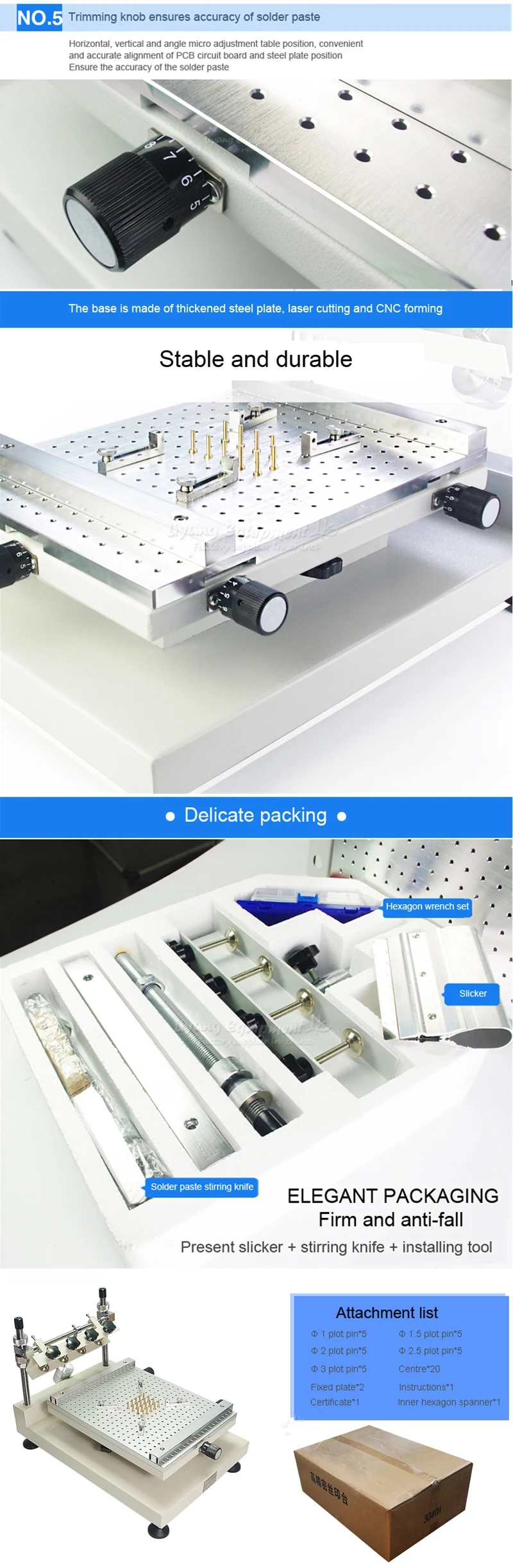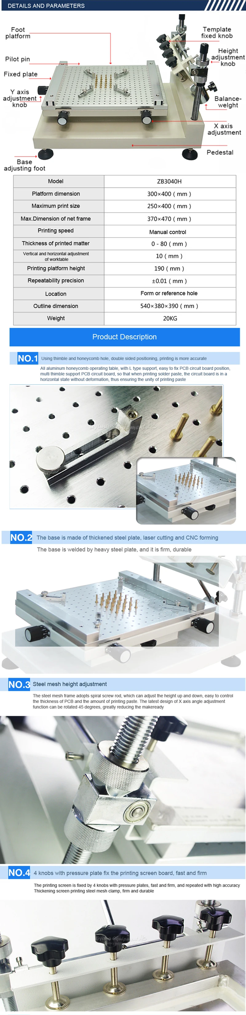 ZB3040H точный шелкография в основном для односторонней пасты для печатной платы или красного клея, Рабочая платформа выбирает высококачественную алюминиевую доску с отверстием для позиционирования сот, плинтус изготовлен из толстой стали, Сварочная форма, прочный, прочный.