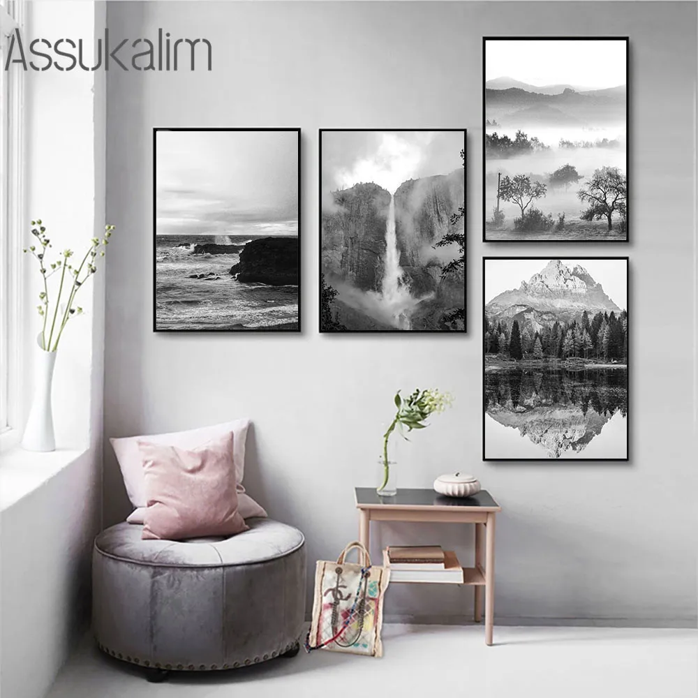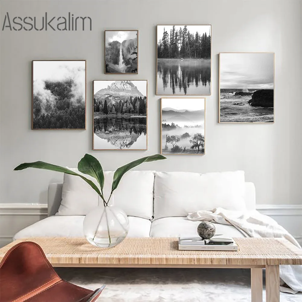 Черно-белый постер, пейзаж, холст, живопись, гор, озеро, настенные ...