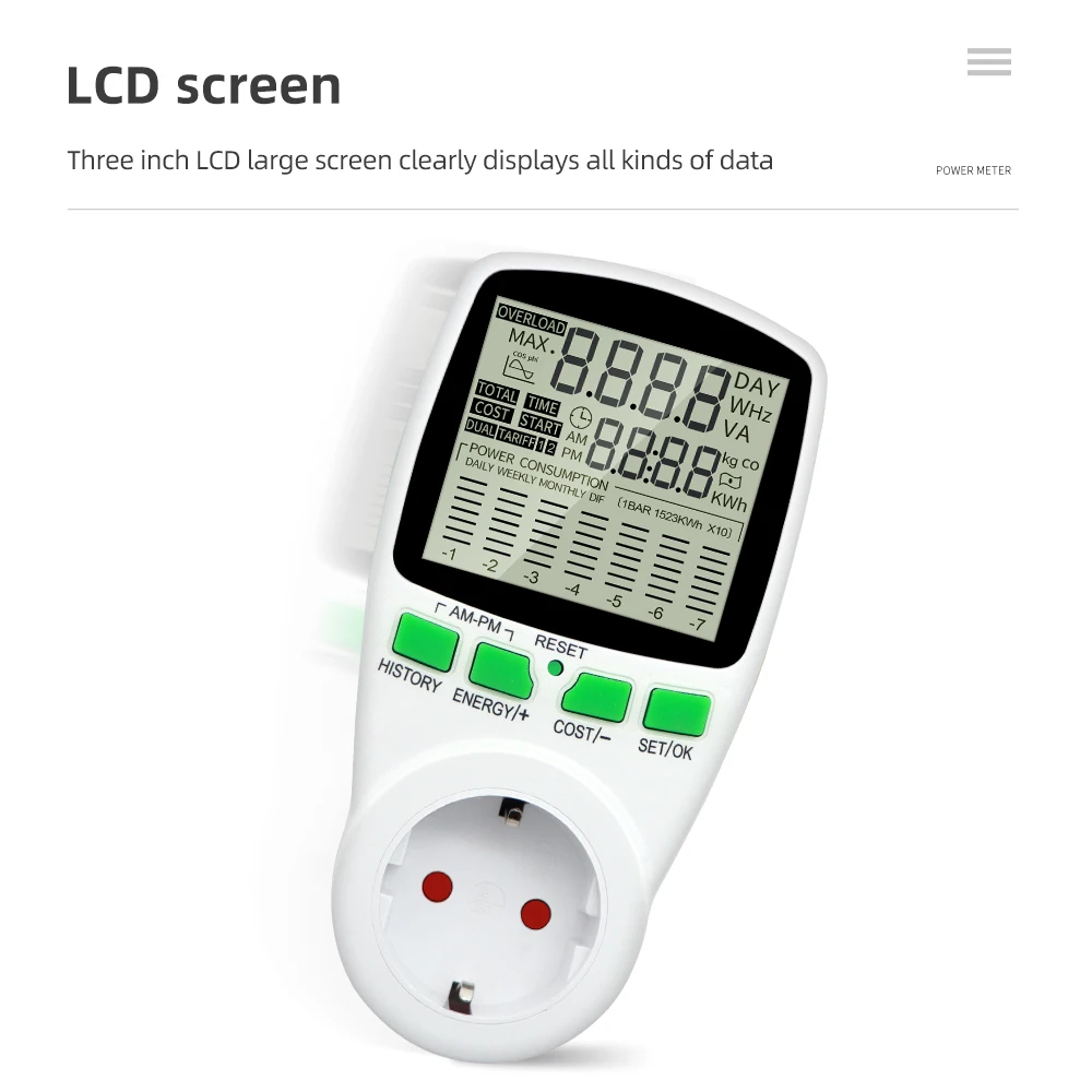 Цифровой тестер мощности, ваттметр, измеритель мощности и напряжения, детектор VU, анализатор электроэнергии, монитор с вилкой Стандарта ЕС, розетка переменного тока 230 В, 50 Гц