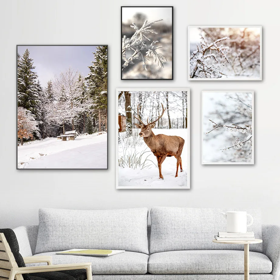 Картина на холсте с изображением зимней снежной сцены, оленя, ветка, цветение сливы, фотография стены для гостиной, Рождества, домашний декор