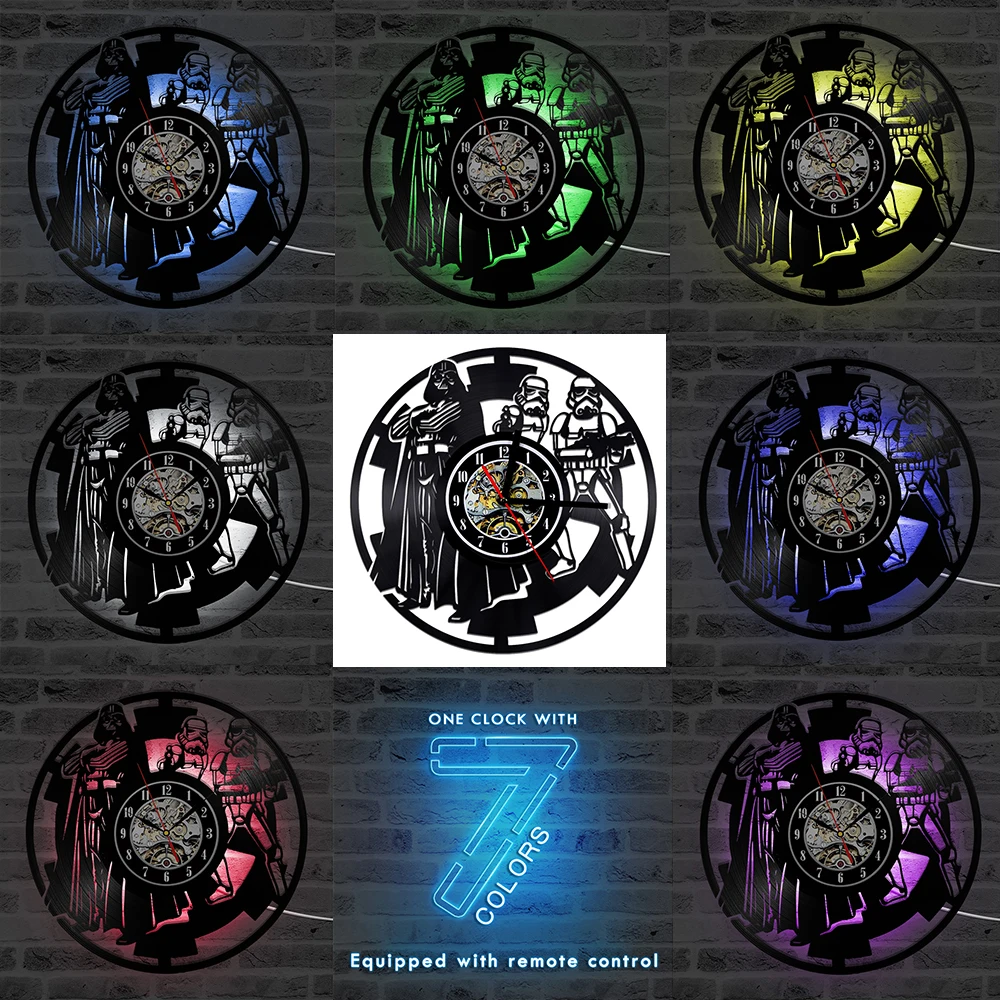 Настенные часы серии войны между звездами с виниловой пластиной, креативные Ретро светодиодсветодиодный часы 7 цветов, украшение для дома, гостиной, кровати