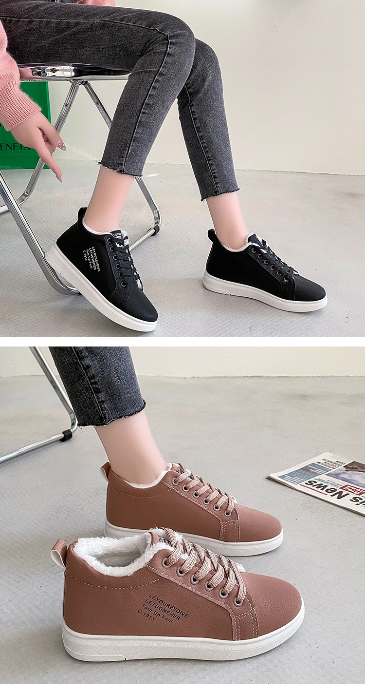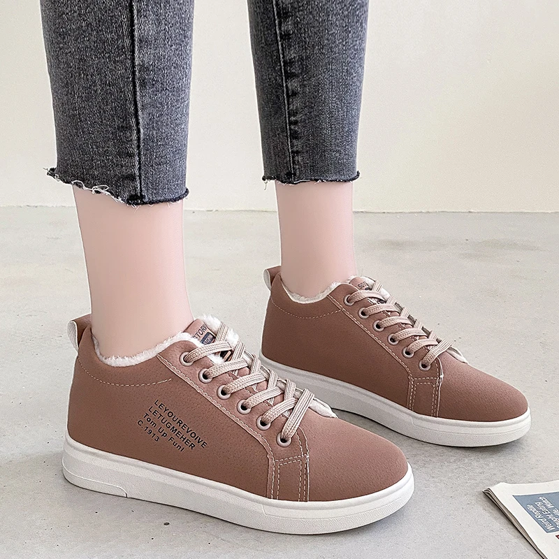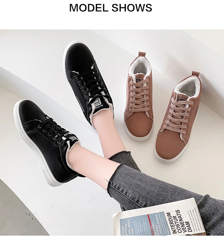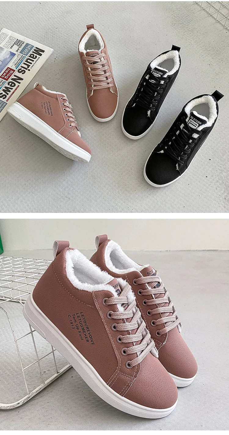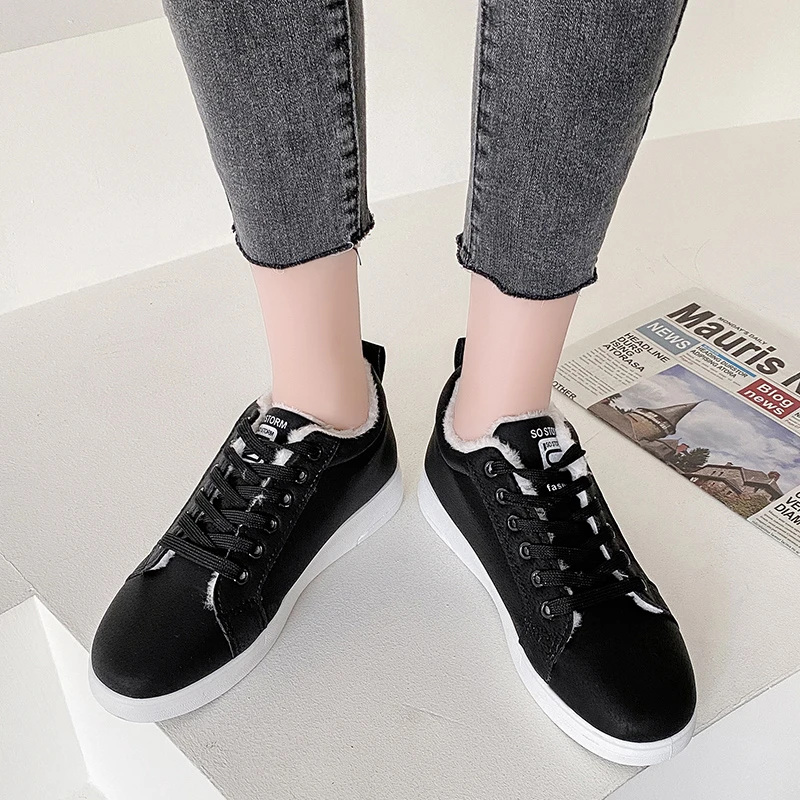 Женские теплые плюшевые кроссовки, повседневные однотонные туфли из ПУ кожи, на шнуровке, зимняя обувь на платформе, 2021