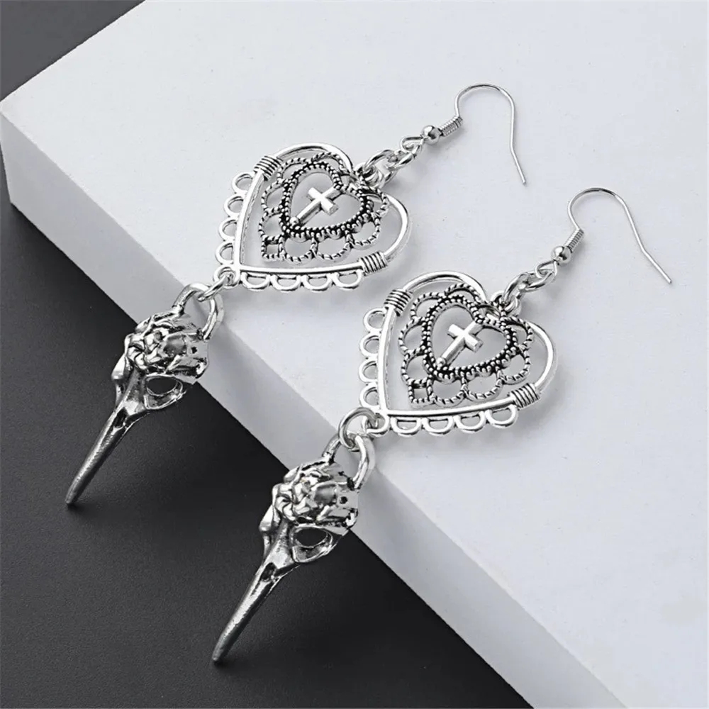Готические серьги в стиле панк с сердцем и крестиком в виде птицы и черепа