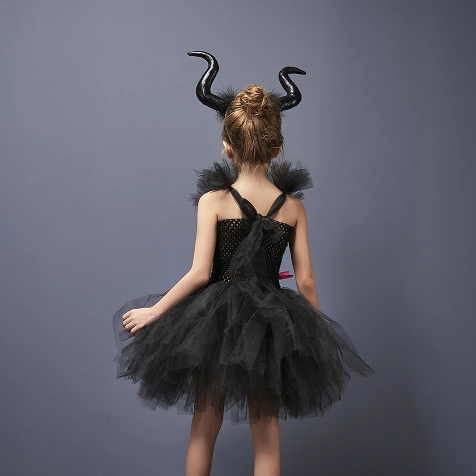 Детское платье на Хэллоуин для маленьких девочек, косплей, тематическая вечеринка, ведьма, королева зла, вязаный Регулируемый лиф, малефисентная Тюлевая пачка