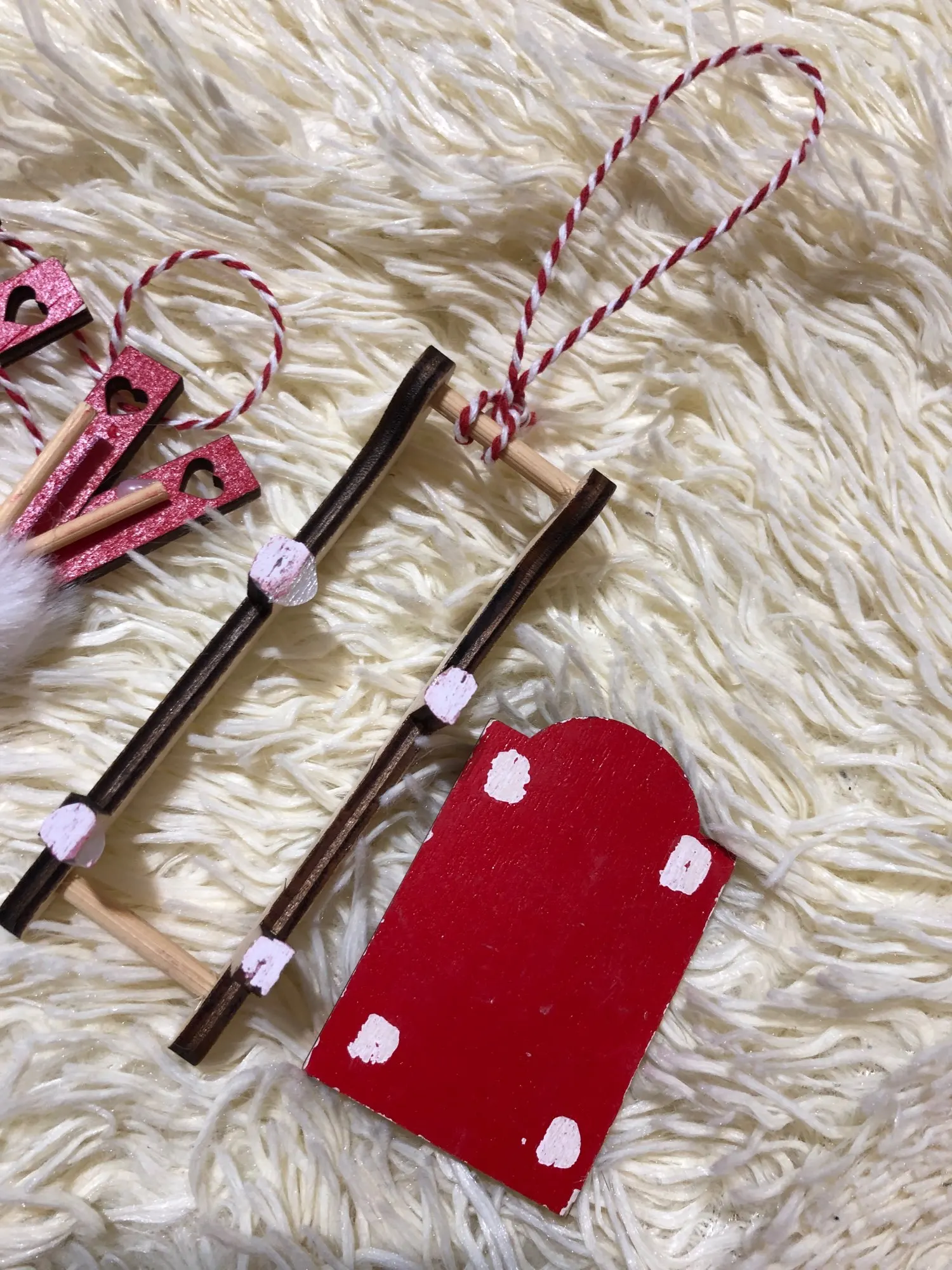Санки сломаны, верх отклеился. По краям краска слетела. Лыжи с палками все в клею. Не понравилось очень.