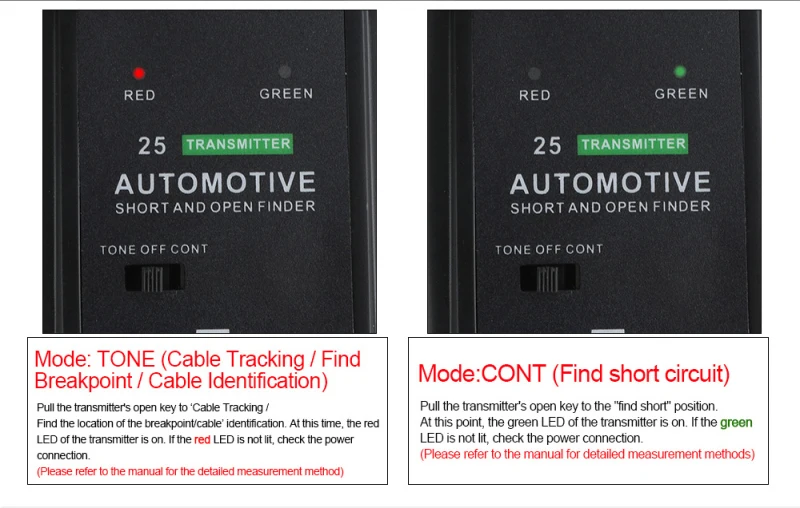 Простота в использовании: Просто подключите передатчик в серии с цепи или провода под тестом, (i. Е.: в месте выдувного предохранителя, через соединитель, в серии с открытым проводом, светильник с гнездом лампы и т. д.), И сканирование цепи/провода с помощью гибкого зонда для отслеживания неисправности