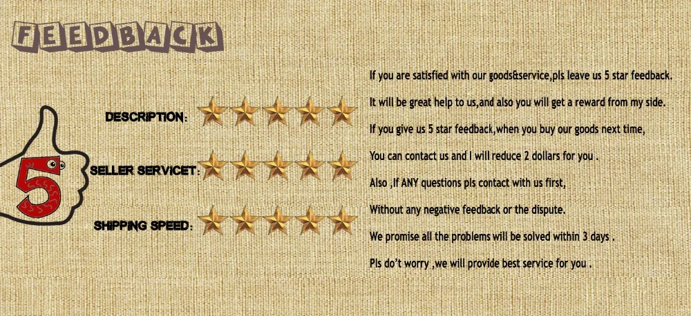 Мы искренне надеемся, что вы дадите нам хорошую оценку. Мы постараемся сделать все возможное, чтобы улучшить качество наших продуктов и услуг. Если у вас есть какие-либо проблемы, вы можете связаться с нами или онлайн-сообщение, мы решим проблемы, пока вы не удовлетворены нашими продуктами и обслуживанием.