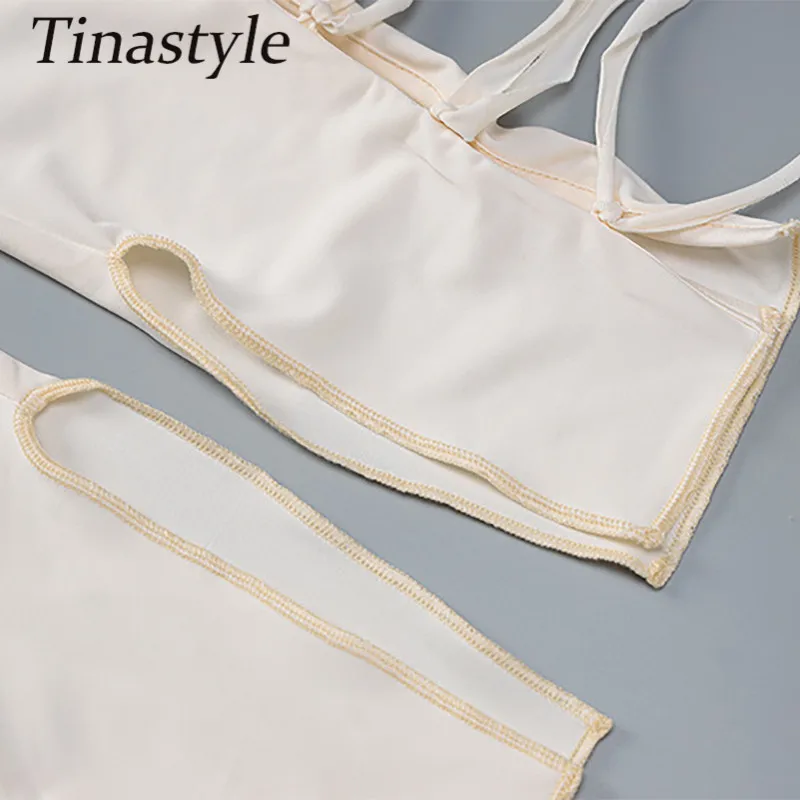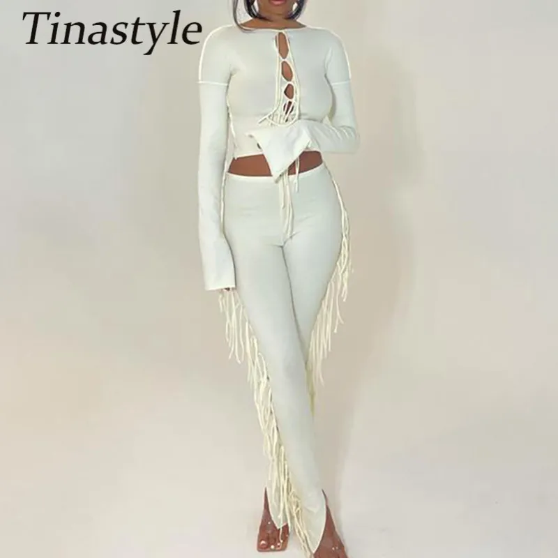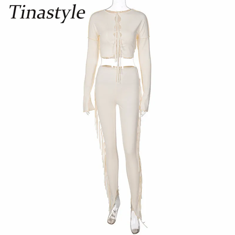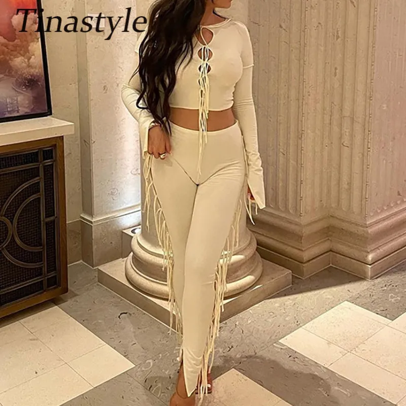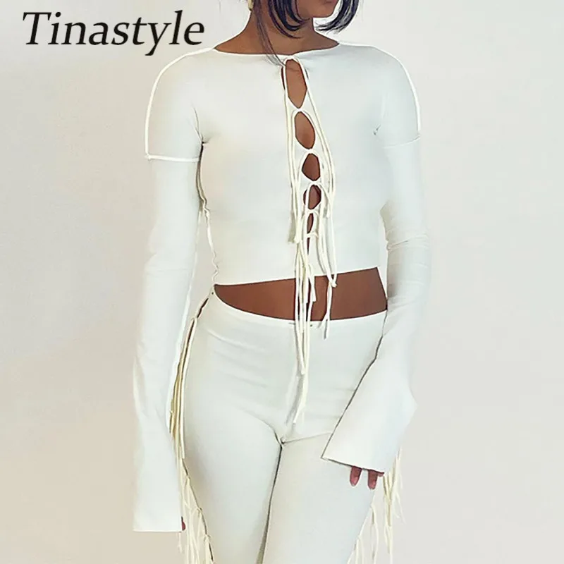 Женский Облегающий комбинезон Tinastyle, из двух предметов, укороченный топ с длинным рукавом и обтягивающие леггинсы с высокой талией вечерние чный костюм