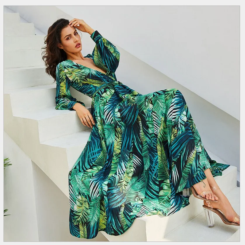 Женское сексуальное длинное платье макси с рукавами-фонариками и поясом, повседневный женский пляжный богемный сарафан с V-образным вырезом для отдыха и путешествий