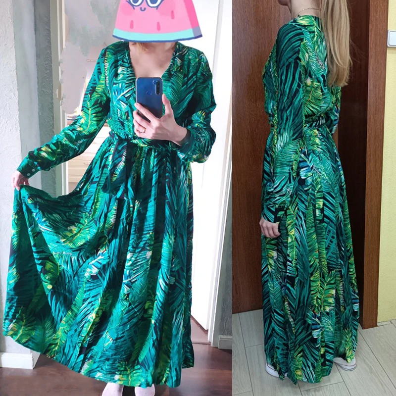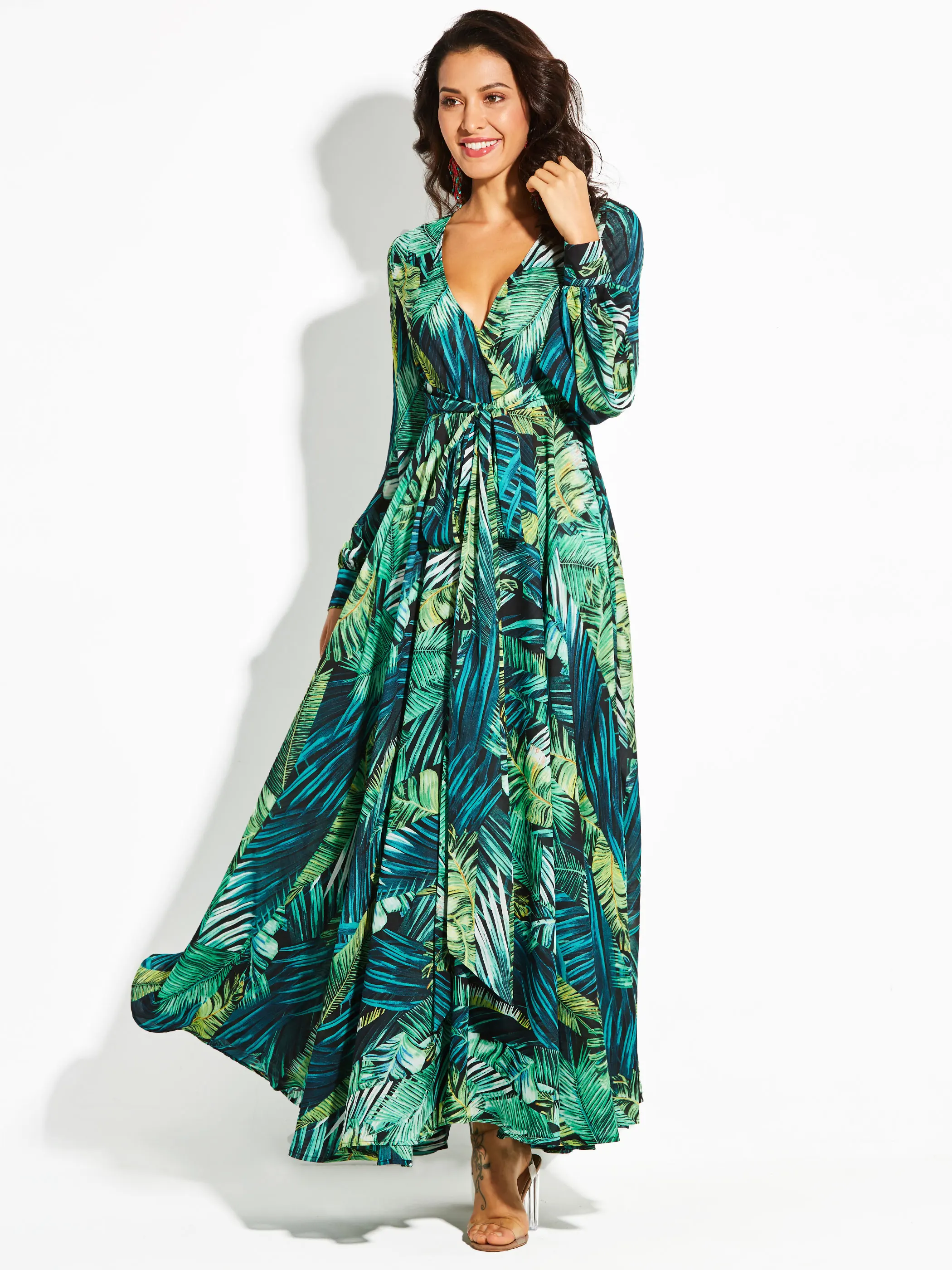 Платье-макси с длинным рукавом, тропическим принтом и V-образным вы...