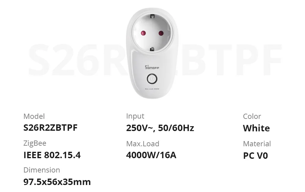 Розетка SONOFF S26R2 Zigbee с поддержкой Wi-Fi, 16 А
