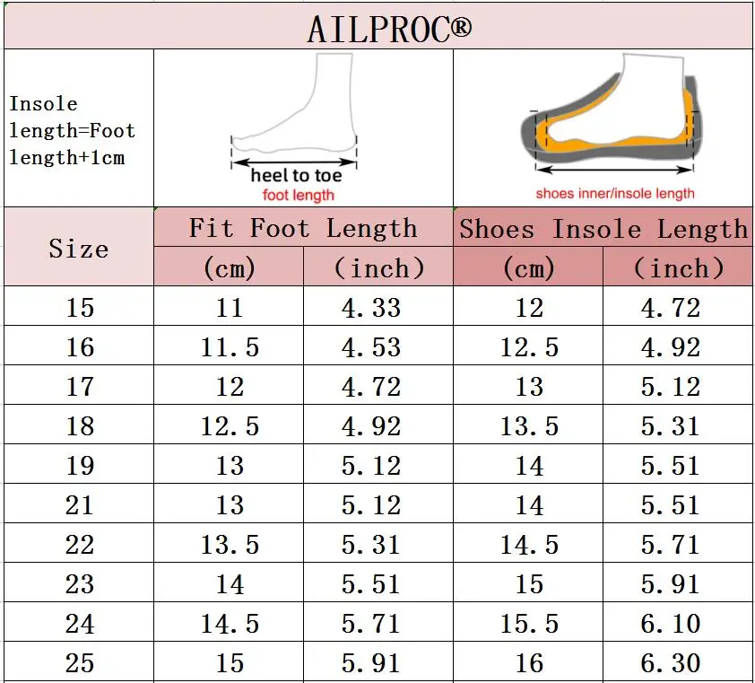 1. Измерьте длину стопы вашего ребенка, как на фото.2. Найдите «подходящую длину стопы» из Таблицы размеров по длине стопы вашего ребенка! Затем выберите размер для покупки. Лучше выбрать больший размер для вашего ребенка. Длина стельки = длина стопы + 1 см3. Если вы не знаете, как выбрать размер, пожалуйста, свяжитесь с нами, мы поможем вам.