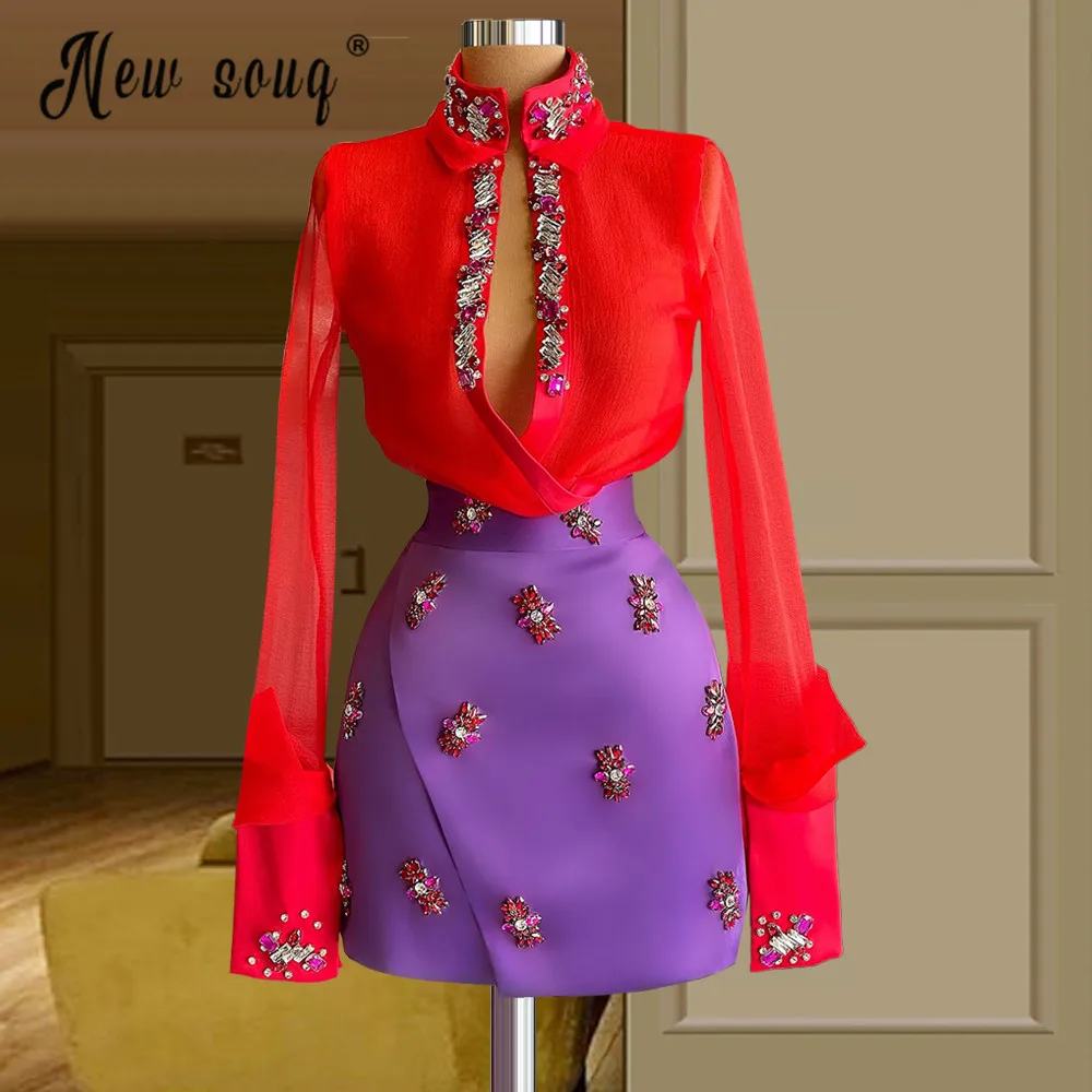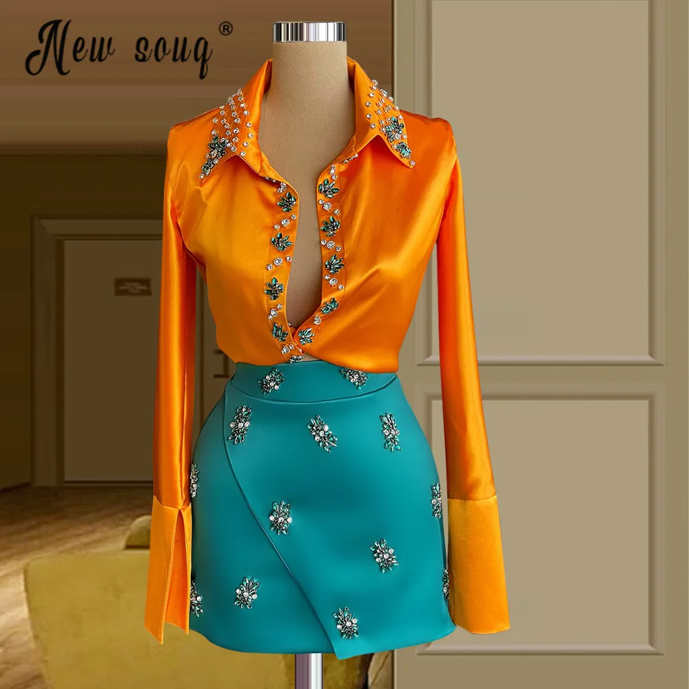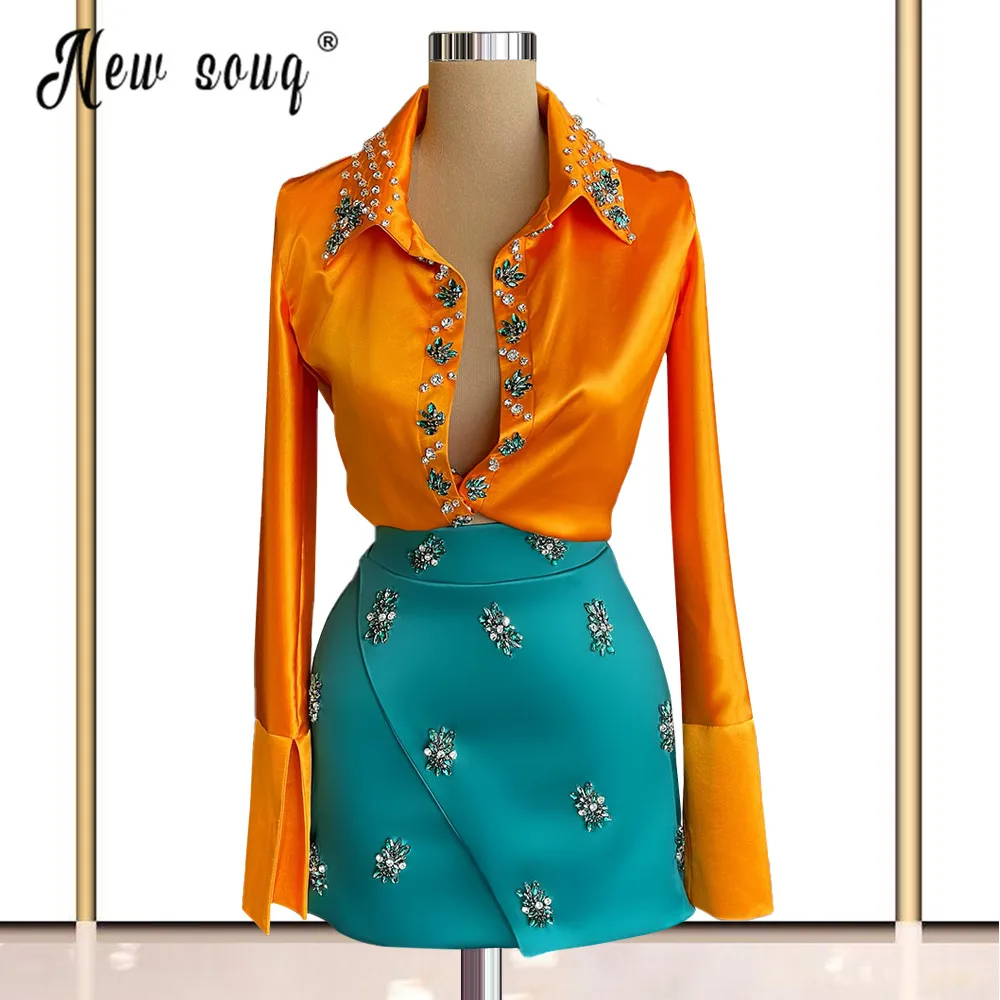 Оранжевые кристаллы, платья из двух частей, глубокий v-образный вырез, длинный рукав, коктейльное платье Merald Green, бисероплетение, длина до колена, платье для выпускного вечера