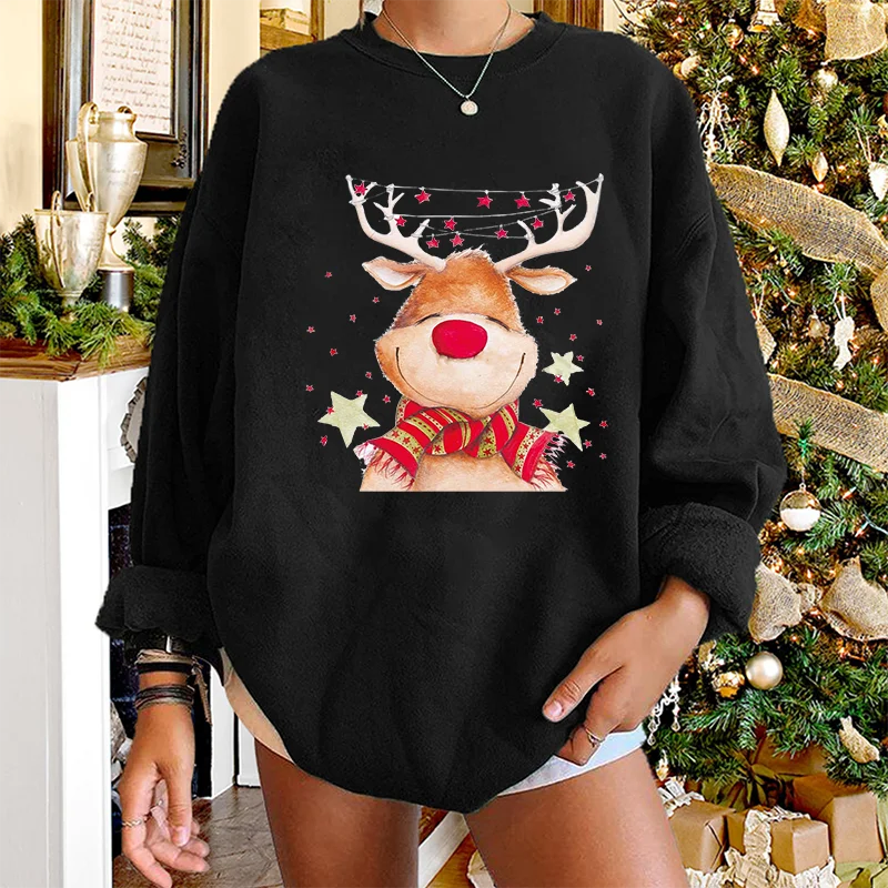 PatternCute Cartoon Reindeer Print Funny Drop Shoulder Sweatshirt Woman