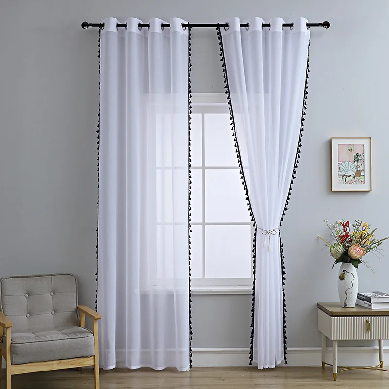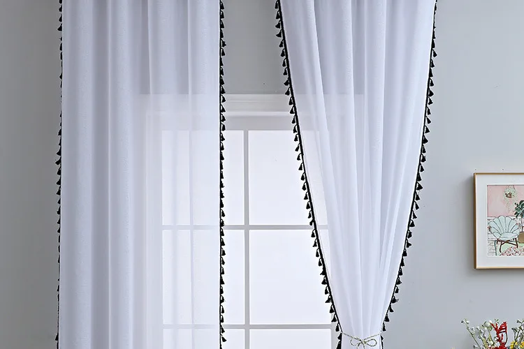 Черные прозрачные шторы с кисточками для гостиной, спальни, льняные белые полупрозрачные шторы, вуаль, панели для декора комнаты принцессы