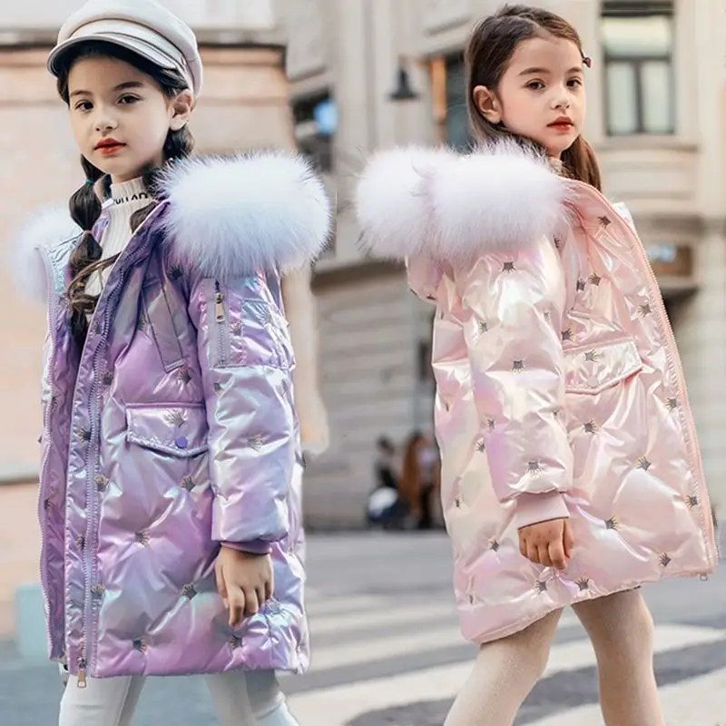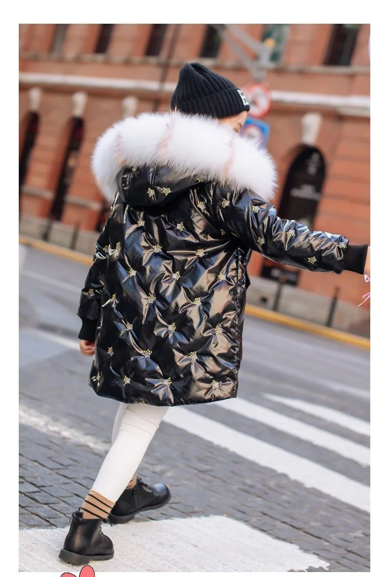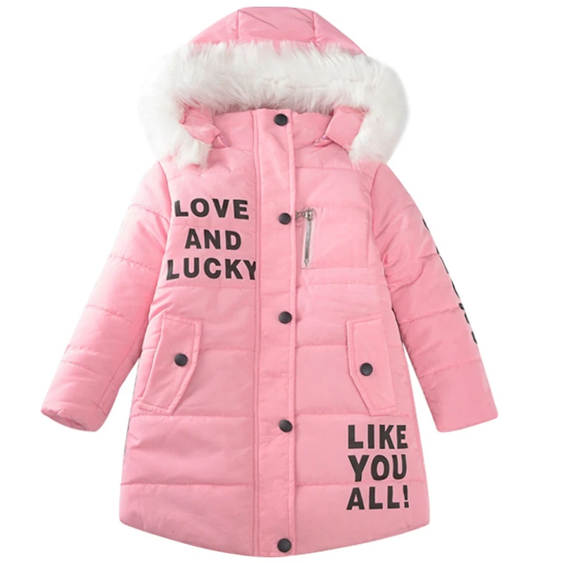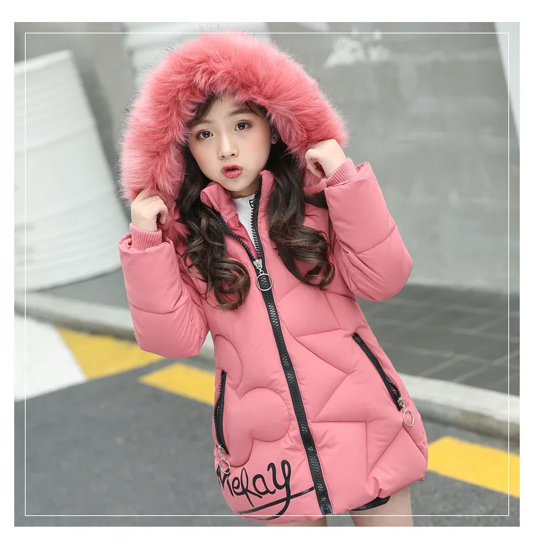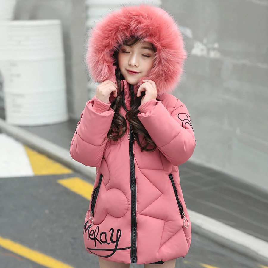Зимнее хлопковое пальто с капюшоном и меховым воротником для девочек, детская теплая водонепроницаемая зимняя куртка средней длины с подкладкой и ярким лицом