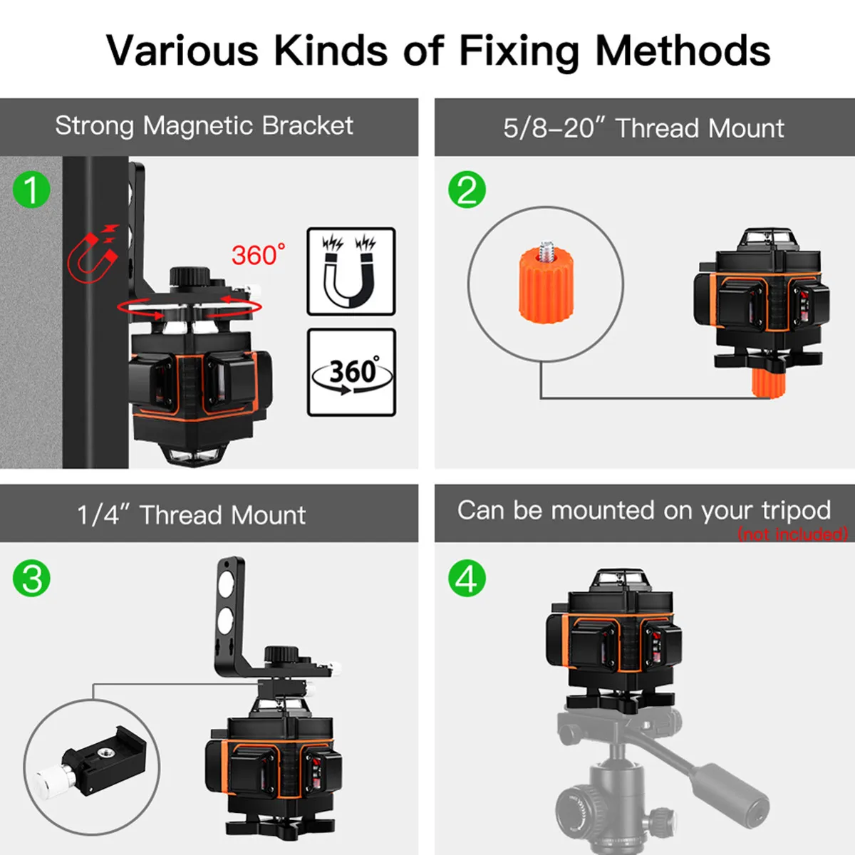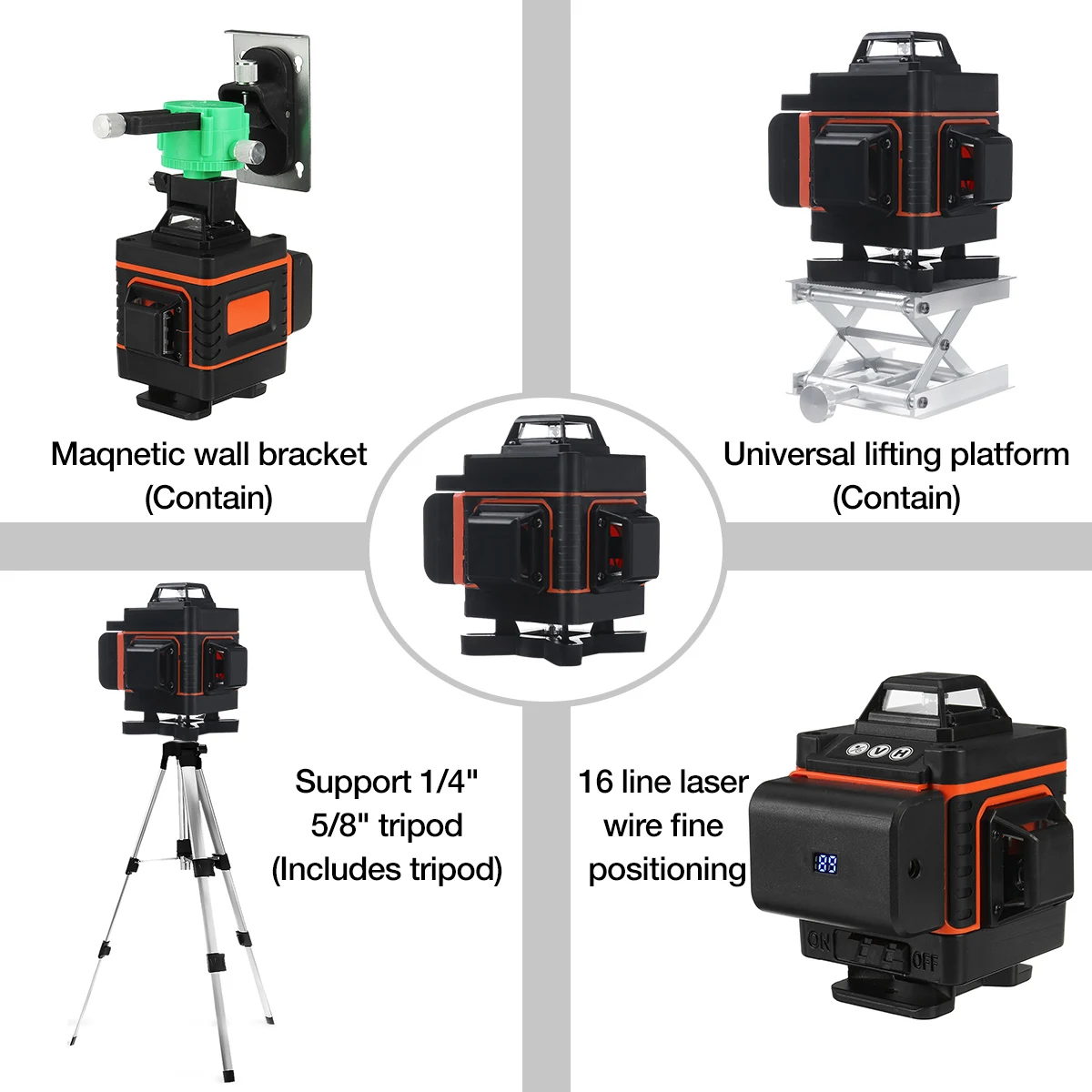 Посылка1 лазерный уровень 4D 16 линий1x подъемная платформа1 мини-пульт дистанционного управления1 Аккумулятор 6000 мАч2x настенный кронштейн (разные размеры)1x Кабель питания1 руководство на английском языке1 штатив 1 м (опция)