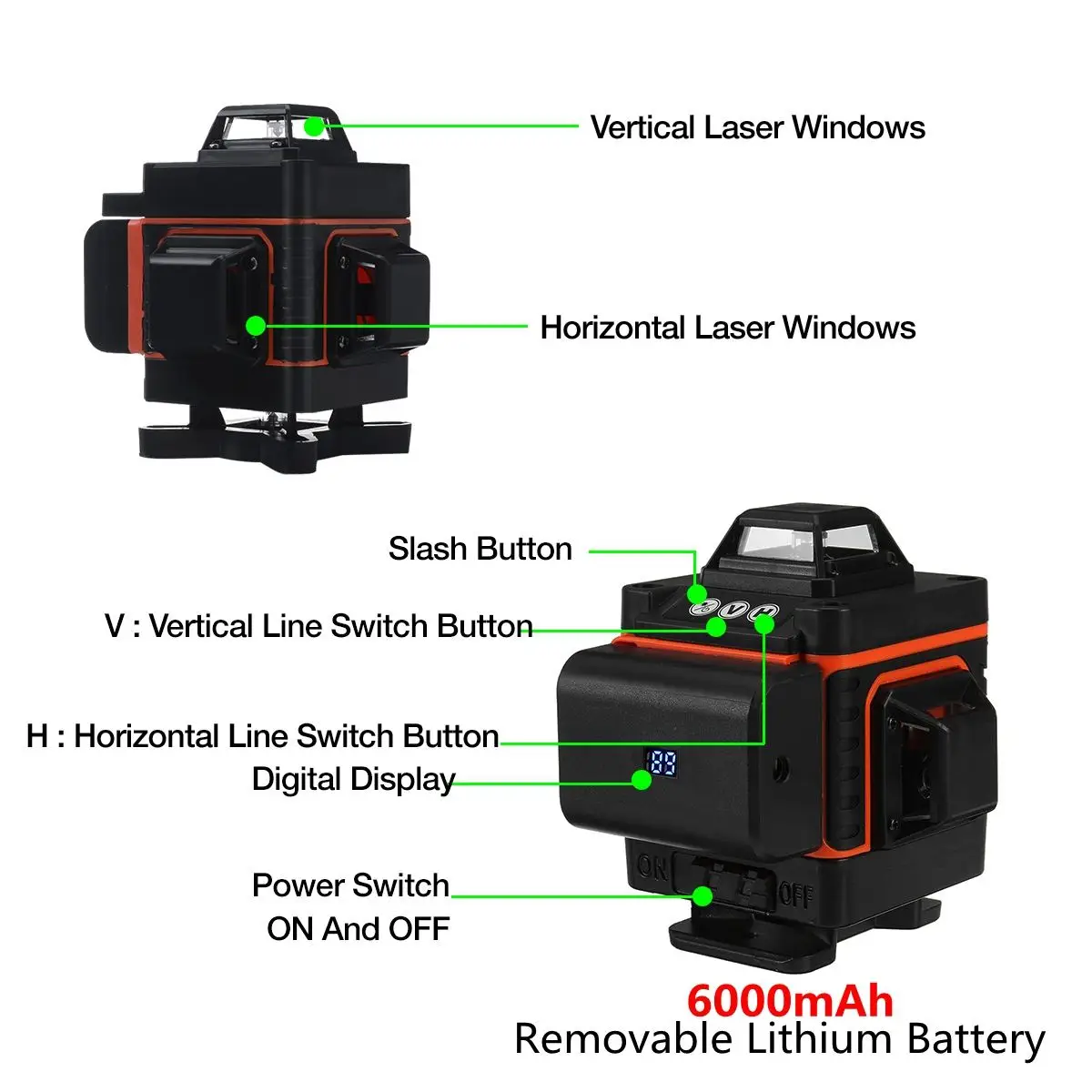 Лазерные уровни, 16 линий, 4D, горизонтальное и вертикальное выравнивание, инструменты для пола, стены, сильный зеленый светильник, 360, самонивелирующиеся Лазерные уровни
