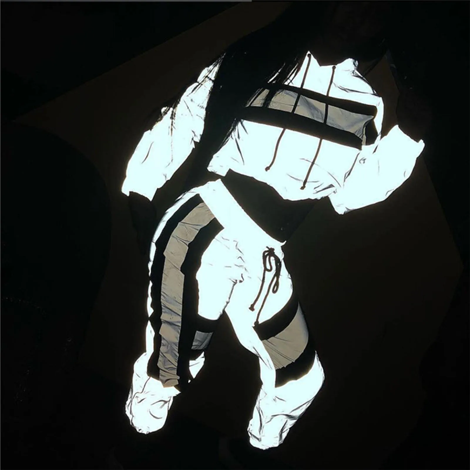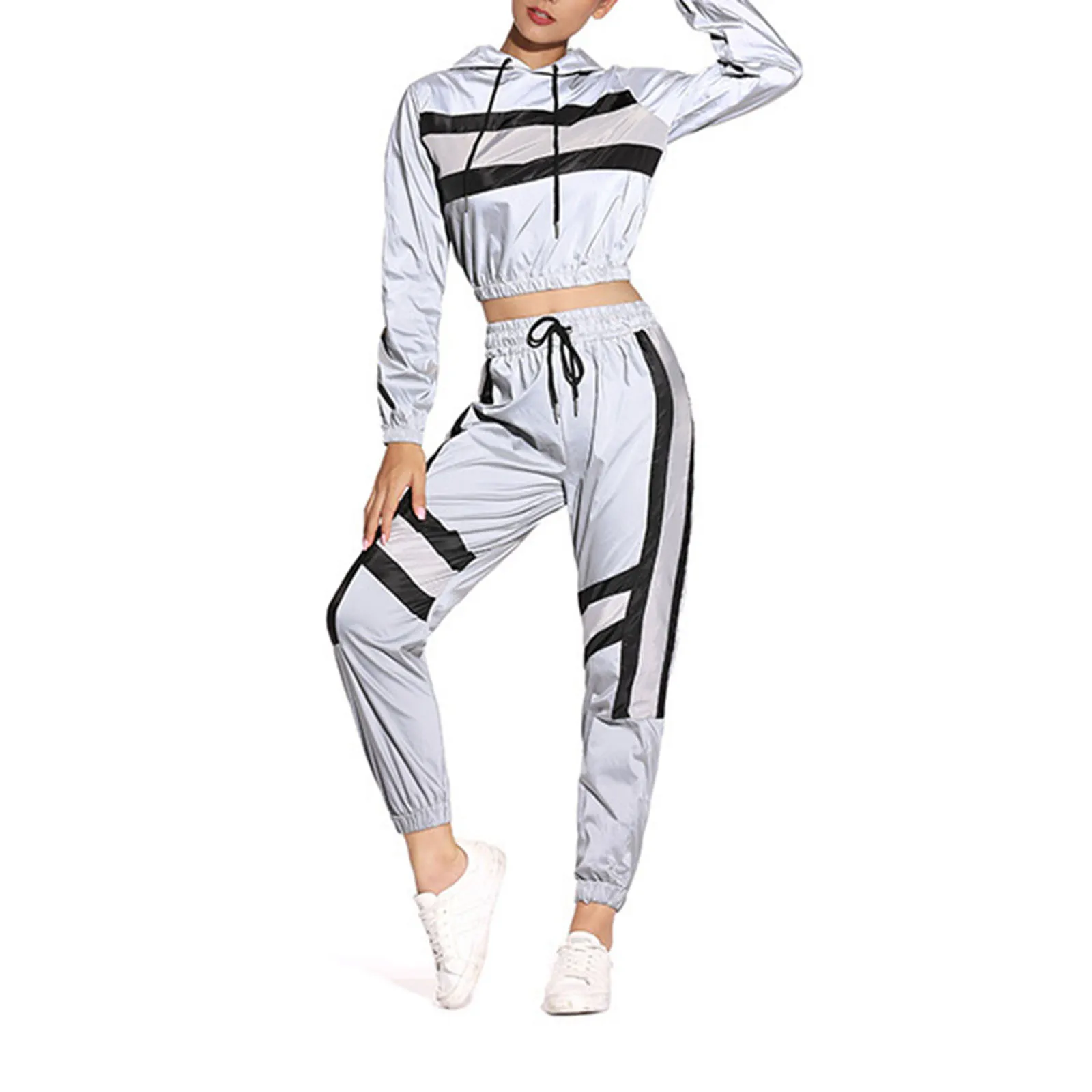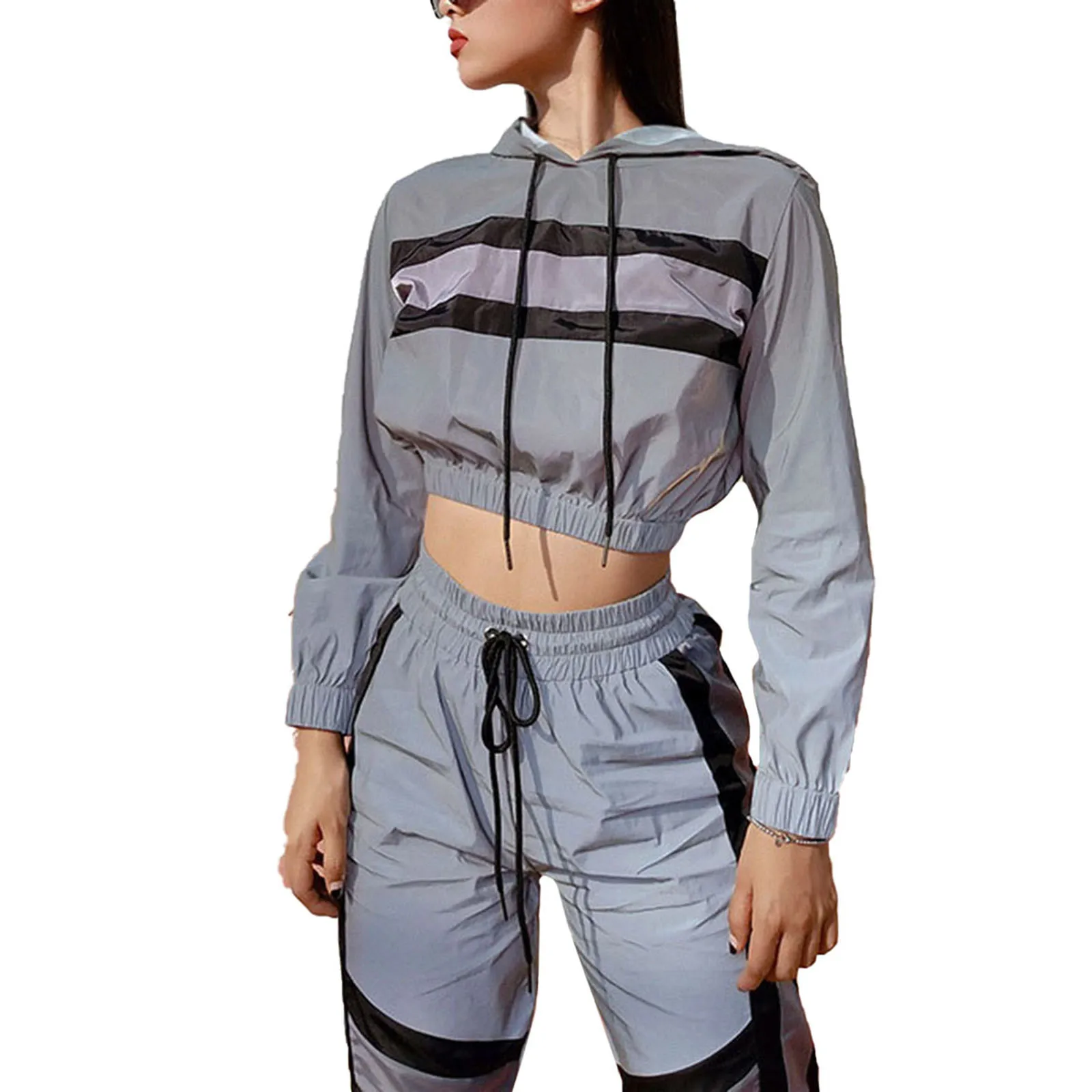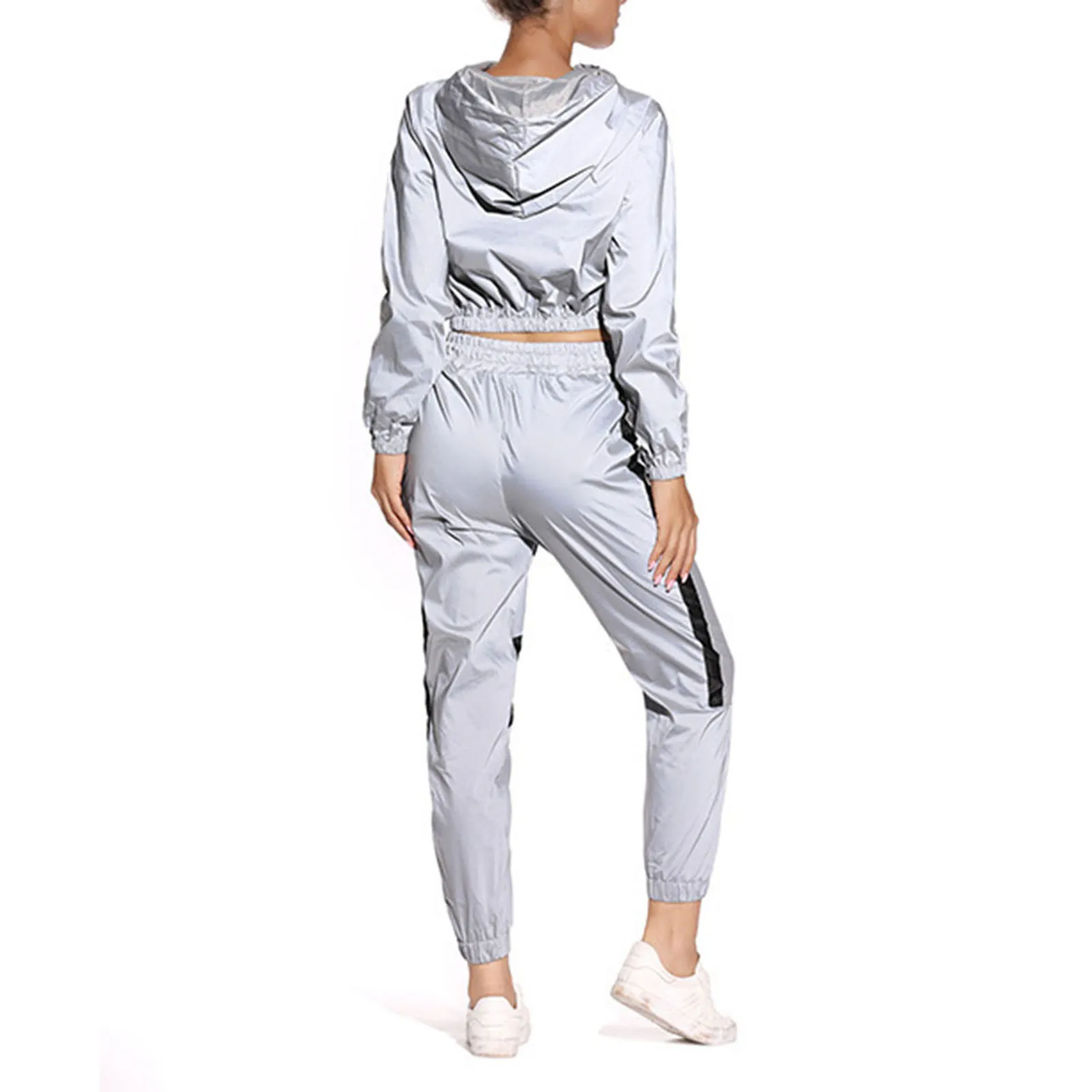 Hirigin Новый Модный комплект из 2 предметов женской светоотражающей спортивной одежды куртка на молнии Топ и спортивные брюки стильный костюм для ночного клуба