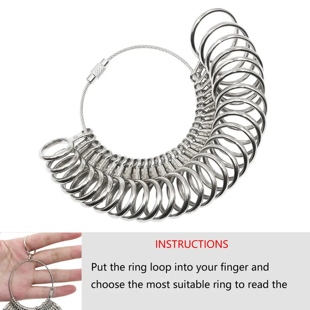 1. Кольцо оправки: подходит для 4 размеров (США, ЕС, FR размер и диаметр) 2. Размер кольца r: Изготовлен из 27 кругов (0-13 размеров) 3: резиновый молоток: используется для стучания колец, молоток принимает резиновую головку, которая может хорошо защитить кольца 4: железное кольцо оправки: сделано из нержавеющей стали и используется для ремонта искаженных колец 5: полировальная ткань и планка наждачной бумаги: полировка металла