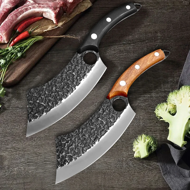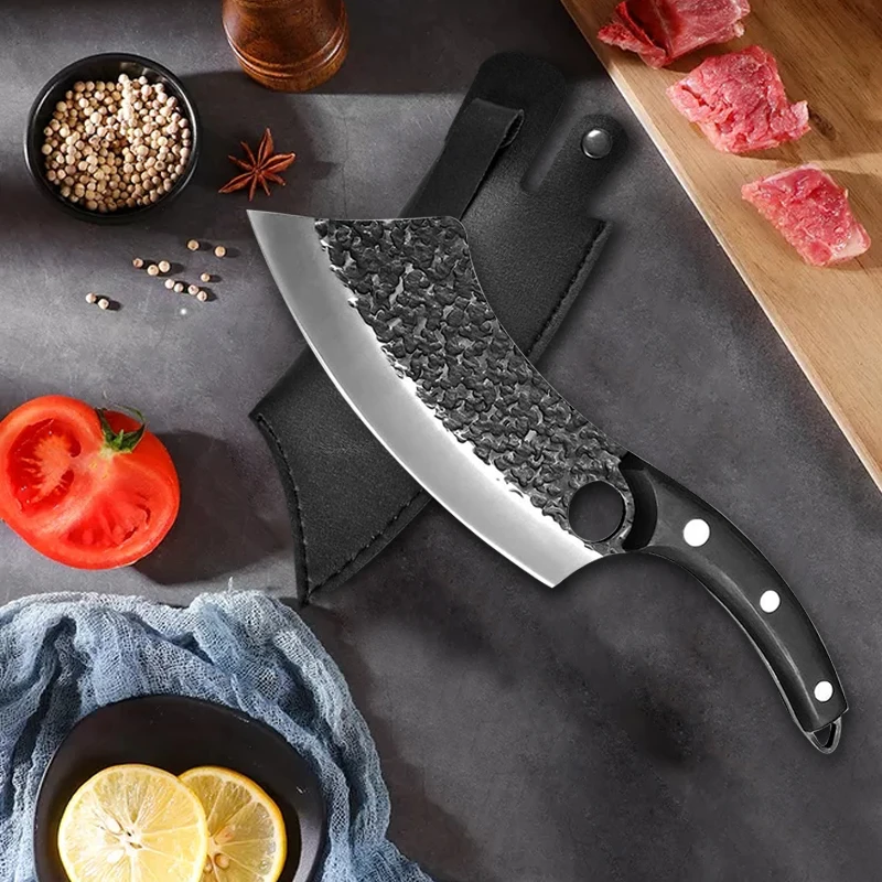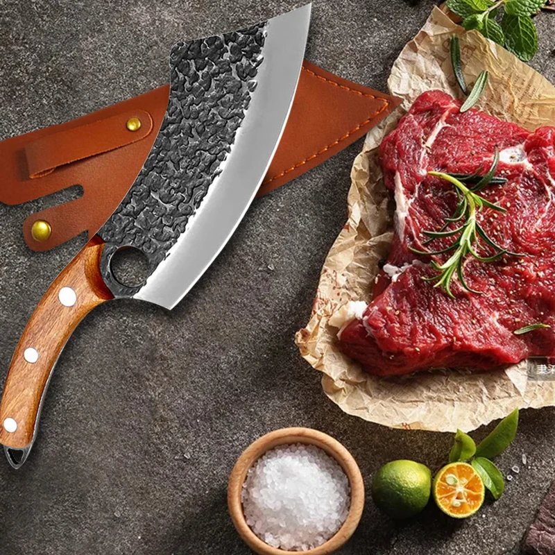 Кованые кухонные ножи, многофункциональный уличный охотничий нож из нержавеющей стали, для мяса, рыбы, овощей, нарезки, мясника с футляром