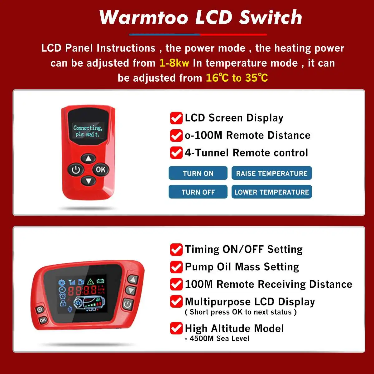 Универсальный дизельный стояночный обогреватель Warmtoo, 12 В, 1-8 кВт, регулируется для грузовиков, автодомов, лодок, автобусов, с ЖК-дисплеем и пультом дистанционного управления