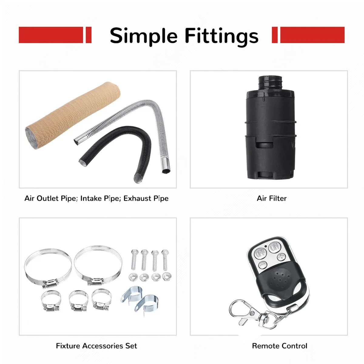 Посылка1 парковочный обогреватель (ЖК-термостат)1 х пульт дистанционного управления (Батарейки в комплект не входят)1 х воздушный фильтр1 х воздуховыпускная труба1 х впускная труба1 х выхлопная труба1 Набор аксессуаров для крепления