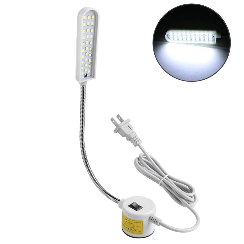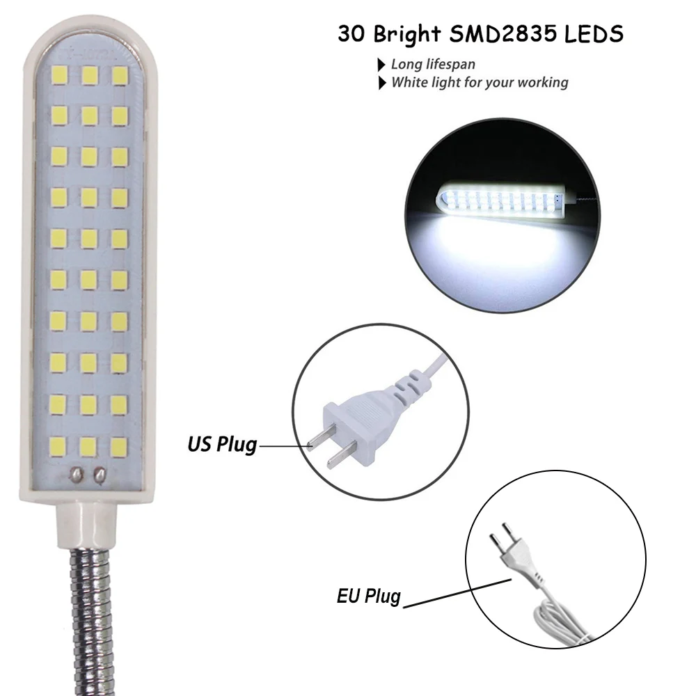 Особенности:1. Имеет прочный пластиковый корпус лампы, безопасный и экологически чистый для использования. 30 светодиодных бусин будут освещать даже самые темные рабочие зоны, экономит энергию, осторожно для ваших глаз.2. Легко крепится и снимается с помощью сверхпрочного магнитного основания. Надежно крепится к швейной машине или любой металлической поверхности.3. Гибкая горловина позволяет отрегулировать светильник именно там, где он вам нужен. Легко установить светильник в желаемом месте.4. С 1,4 м достаточно длинный переменного тока подключите шнур питания, вы можете подключить его к вашим идеальным положении.