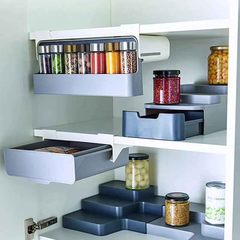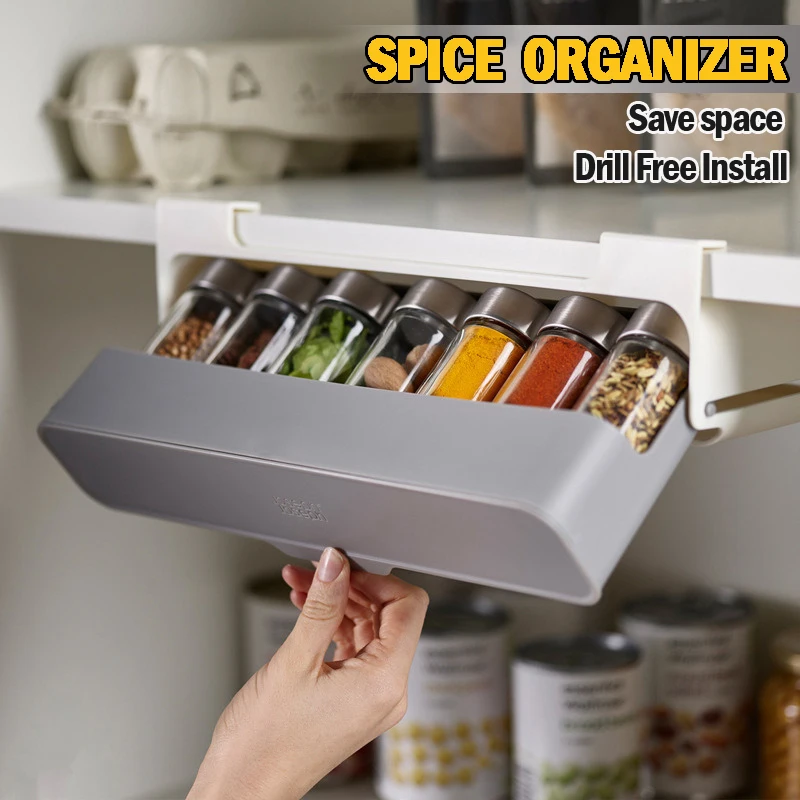 Органайзер для специй под полкойС пространством в шкафу часто премиум-класса, дизайн органайзера для специй под полкой позволяет использовать неиспользованное пространство под полкой. Отличается умным выдвижным отсеком, вмещающим до шести стандартных банок для специй (не входят в комплект).