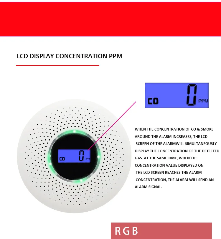 * Высокоточный электрохимический датчик и инфракрасный фотоэлектрический датчик* ЖК-дисплей концентрации PPM* 3*1,5 V AA батарея питания* Сверхдлительное время работы в режиме ожидания, низкое потребление тока* Предупреждение о низком заряде батареи* Функция памяти сигнализации* Тревожная пауза (режим hush)* Звуковой и флэш-сигнал и светодиодный сигнальный сигнал* Технология производства SMT, надежная стабильность