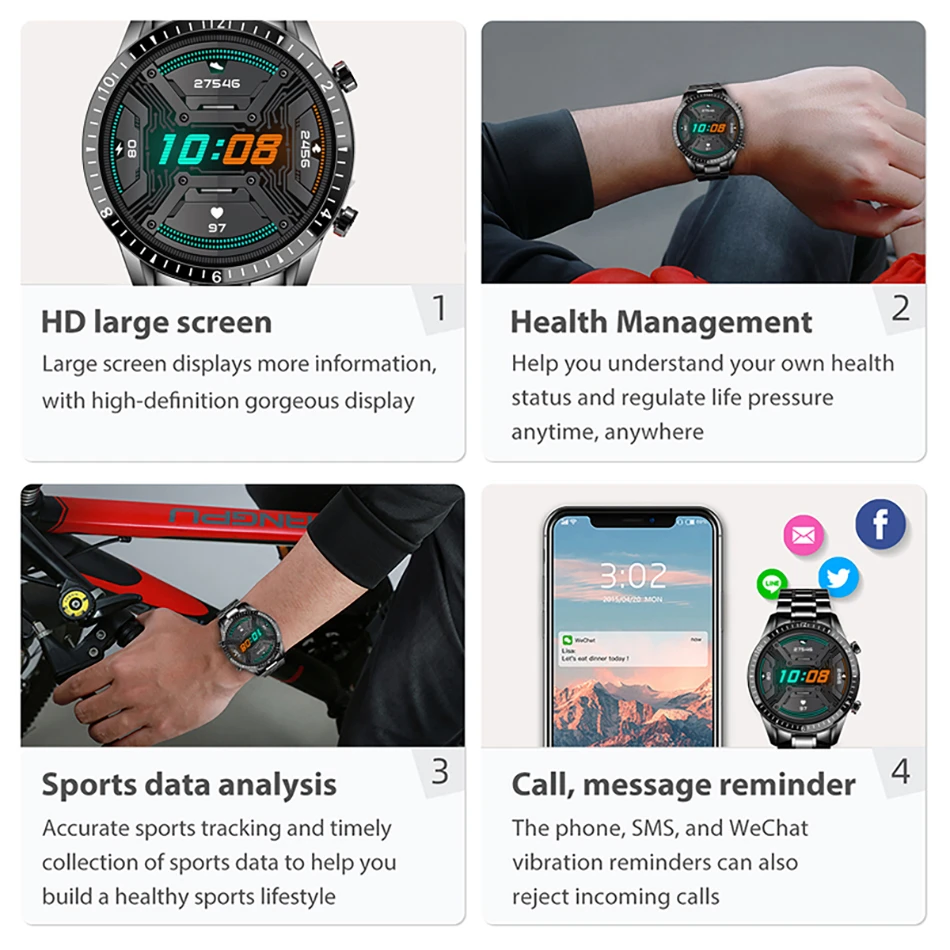 Прием/отклонение звонков/набор звонков, мониторинг сердечного ритма, Мониторинг Артериального/кислородного давления, мониторинг сна, напоминание о движении, шагомер с портами/потребление калорий/Запись трека/Время тренировки, напоминание о звонках и отображение, нажимается и отображается сообщение, камера с дистанционным управлением, автоматическое измерение пульса, мультиспорт, Измерение, напоминание о часах, напоминание о будильнике, стандартные 5 видов циферблатов. Индивидуальные приложение для часов граней на выбор.