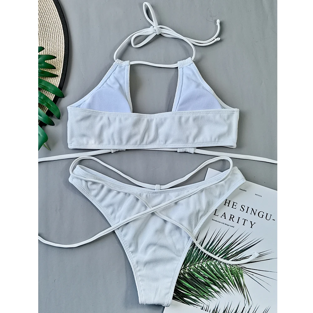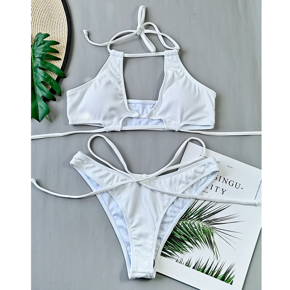 Новинка 2021, сексуальное бикини с вырезами, купальник в рубчик, женский купальный костюм, женский белый комплект бикини, купальный костюм, пляжная одежда для плавания для женщин