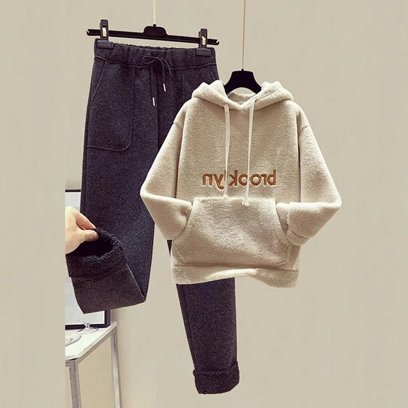 Женский флисовый спортивный костюм с надписью, зимний Повседневный Женский костюм с капюшоном, брюки и свитшот, костюмы, женские комплекты, комплект из двух предметов, 2021