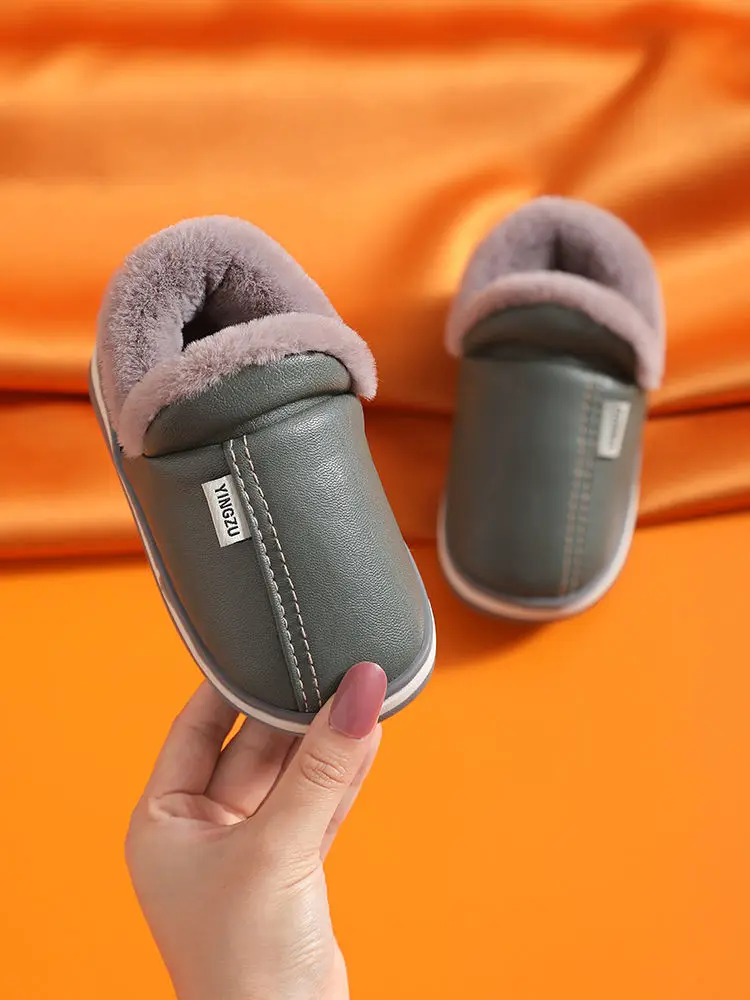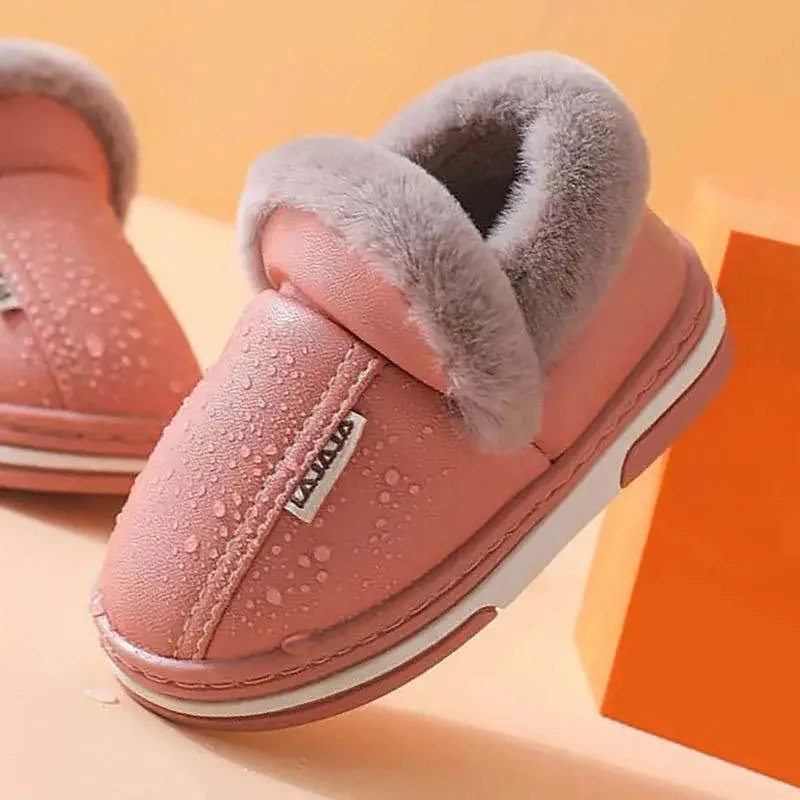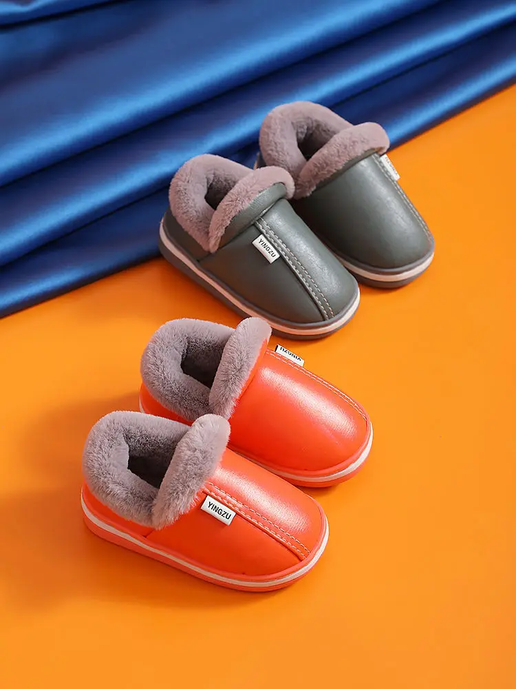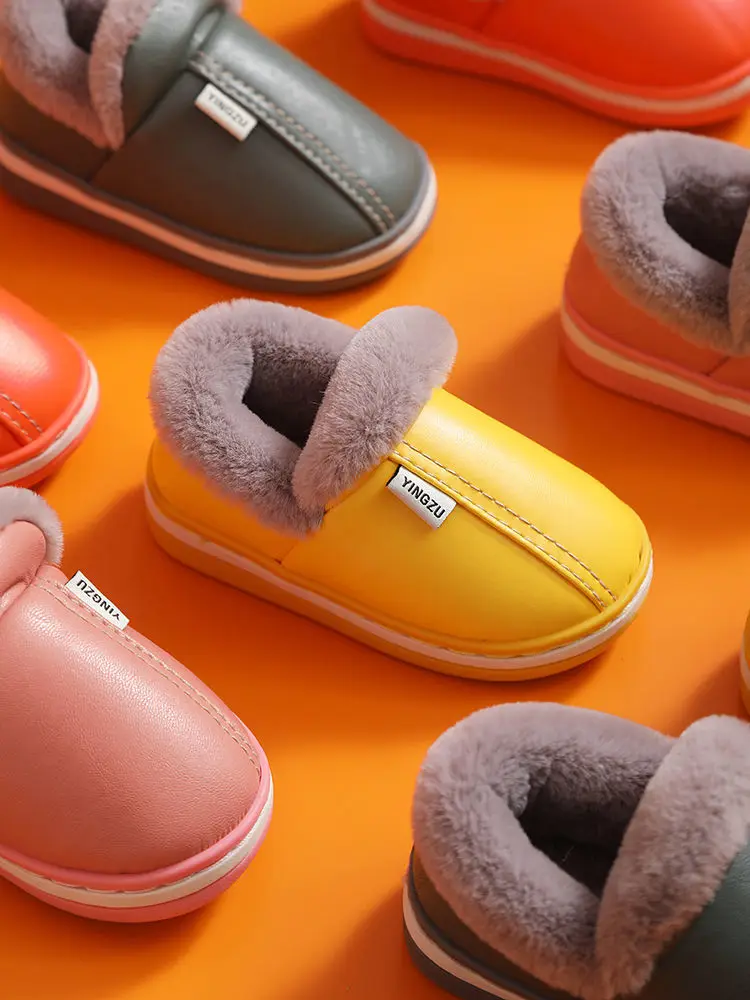 Зимние Детские повседневные туфли, водонепроницаемые плюшевые теплые Нескользящие домашние мягкие пушистые тапочки из искусственной кожи больших размеров 22-45