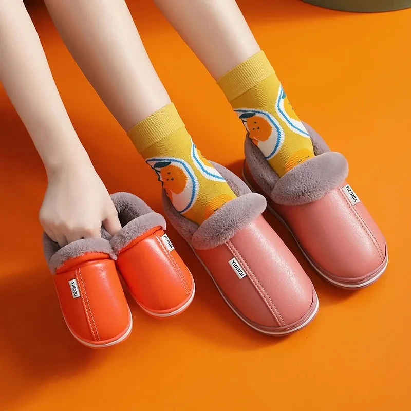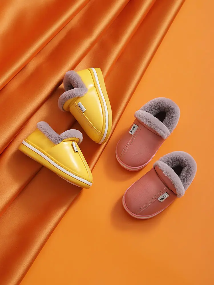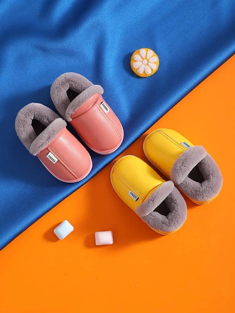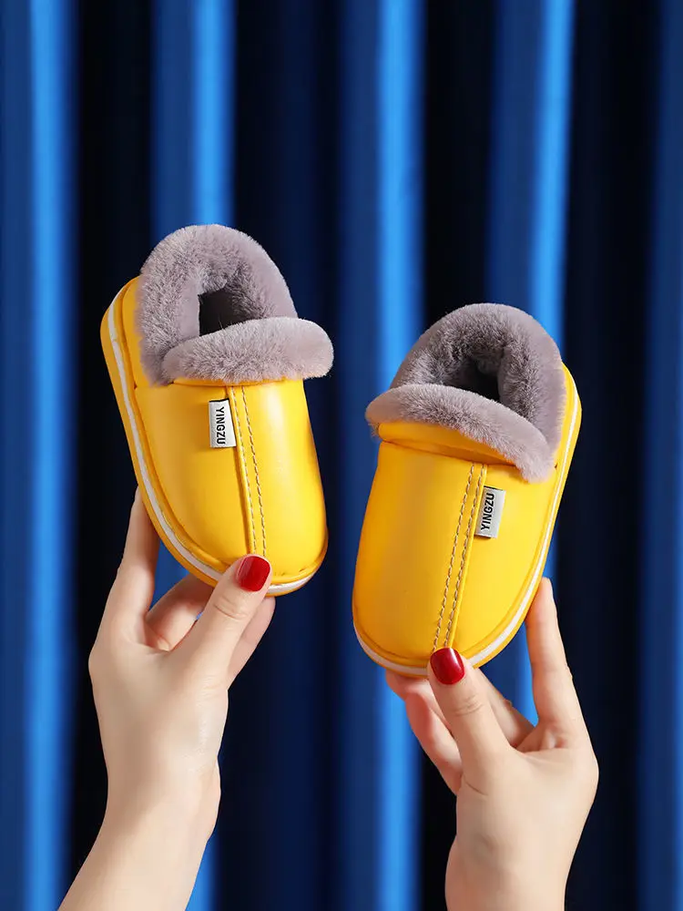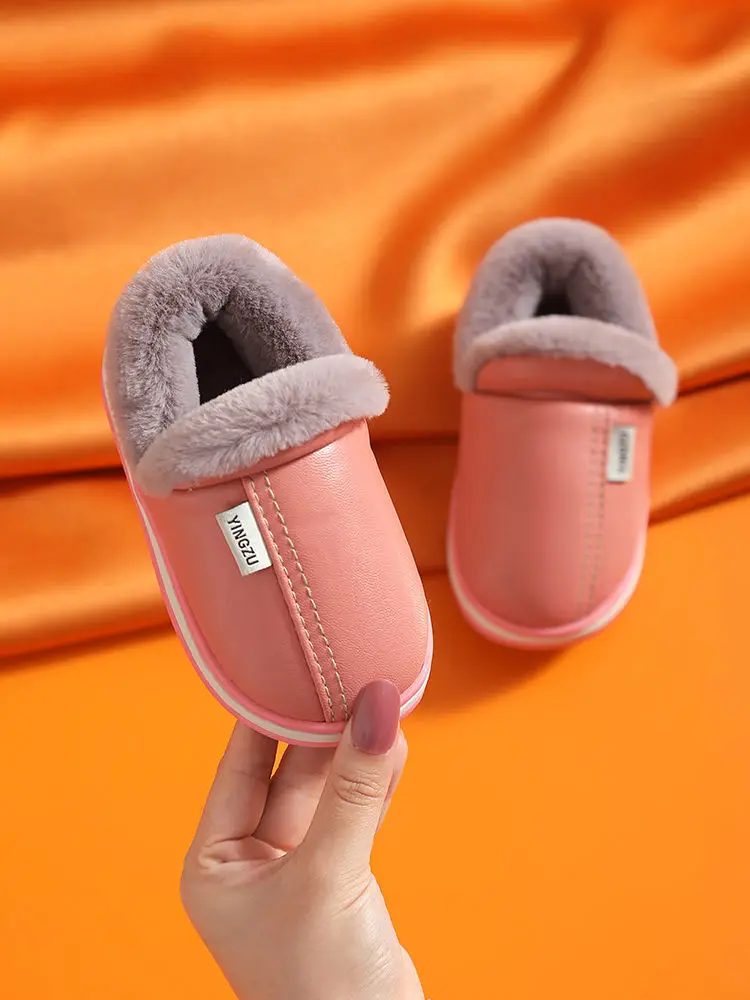 Зимние Детские повседневные туфли, водонепроницаемые плюшевые теплые Нескользящие домашние мягкие пушистые тапочки из искусственной кожи больших размеров 22-45