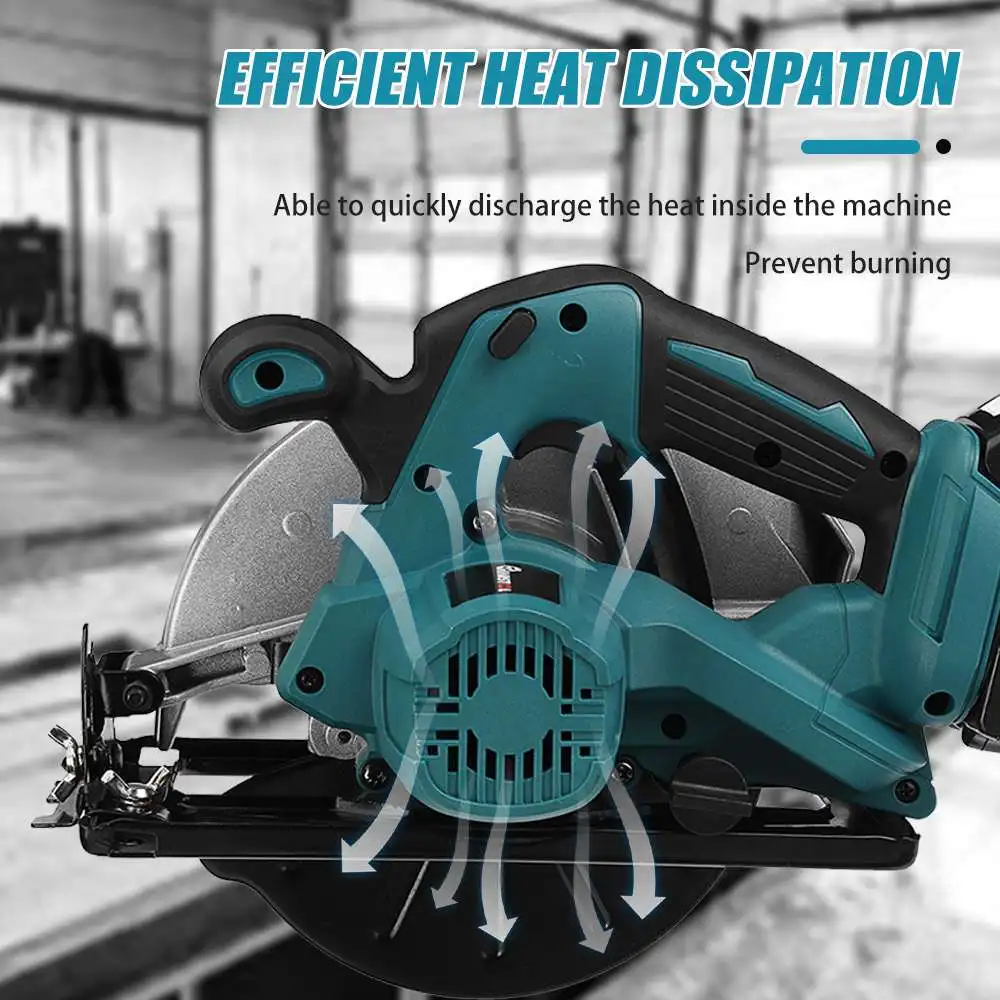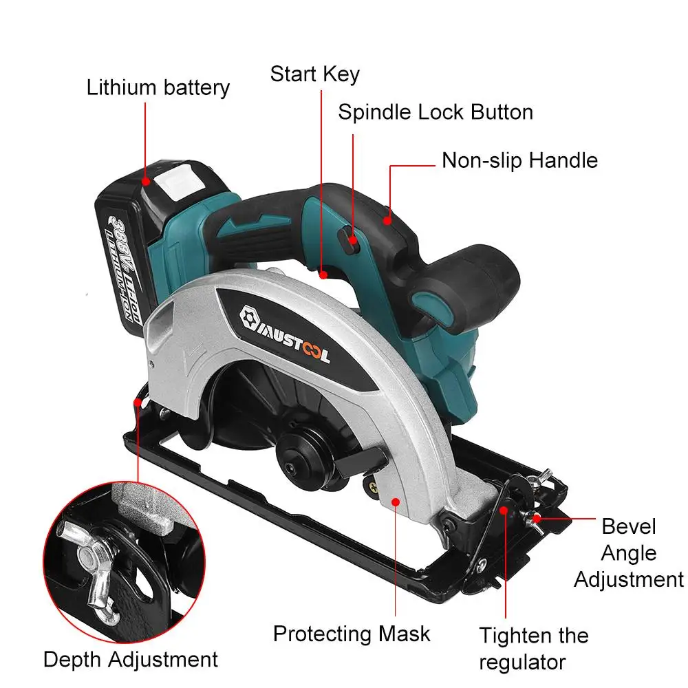 Характеристики:Название: электрическая циркулярная пилаТип: циркулярная пилаНапряжение: 18 вДиаметр лезвия: 7 дюймов/180 мм (не входит в комплект)Скорость без нагрузки: 10800 об/минЕмкость аккумулятора: 22900 мАчПодходит для пилы со средней апертурой 20 мм или 25,4 мм