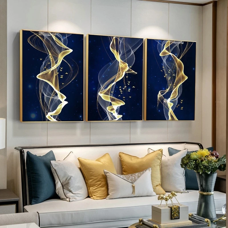 Современная Синяя абстрактная картина на холсте в скандинавском стиле Настенная картина с изображением птиц с золотой лентой Настенная картина для гостиной