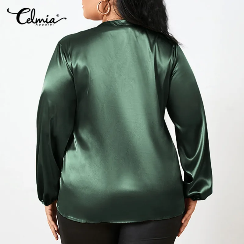 Модные атласные блузки Celmia для женщин, сексуальные однотонные топы с V-образным вырезом, женские элегантные офисные блузки с длинным рукавом, повседневные женские блузки