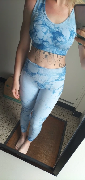 Прекрасный комплект. Яркий. Смотрится дорого, стильно, в зале все внимание точно ваше. Ткань очень приятная к телу и хорошо тянется. Швы ровные, вроде лопнуть ничего не должно. На параметры: 86-64-89 топ сел идеально, но для бега не подойдет, так как грудь не держит. А вот лосины в талии очень велики, но они не спадут. Буду ушивать, ведь смотрится не особо эстетично в талии. Сама ткань тянется хорошо, думаю, на размер м лосины подошли бы без проблем, но насколько безопасно в таких приседать, не повредив их, не знаю. Довольна невероятно! Берите не задумываясь.
