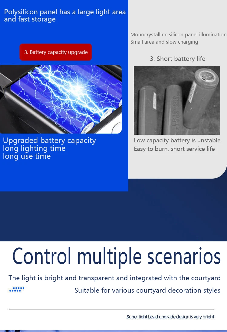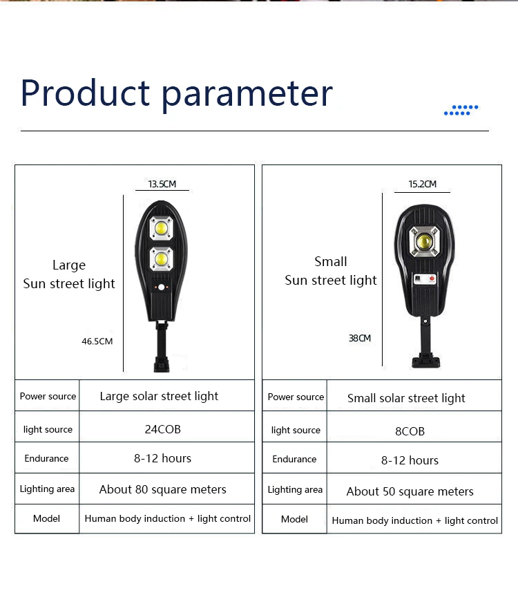 1. Солнечная панель: 6 В2. Батарея: 3,7 V 4000 -6000 mAh ,18650 литиевая батарея3. Светодиодный: белый светильник4. Размер: 55*37 см/46,5*35,5 см5. Светодиодный Цвет: белый6. Способ установки: винты7. Режим работы: 3 различных режима освещения8. Материал: АБС-пластик + Поликарбонат9. Время работы: может работать более 5-24 часов10. Переключатель: пульт дистанционного управления11. Водонепроницаемость: IP66