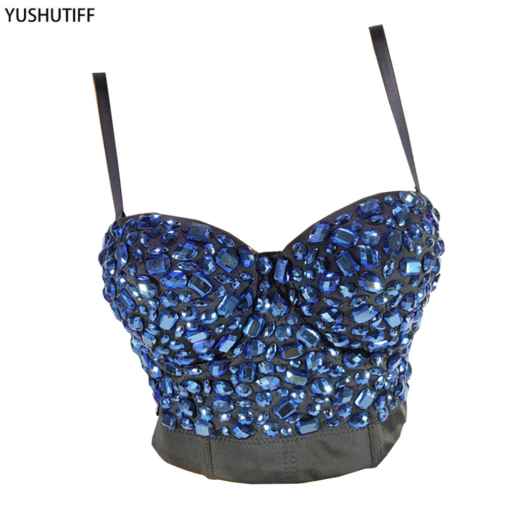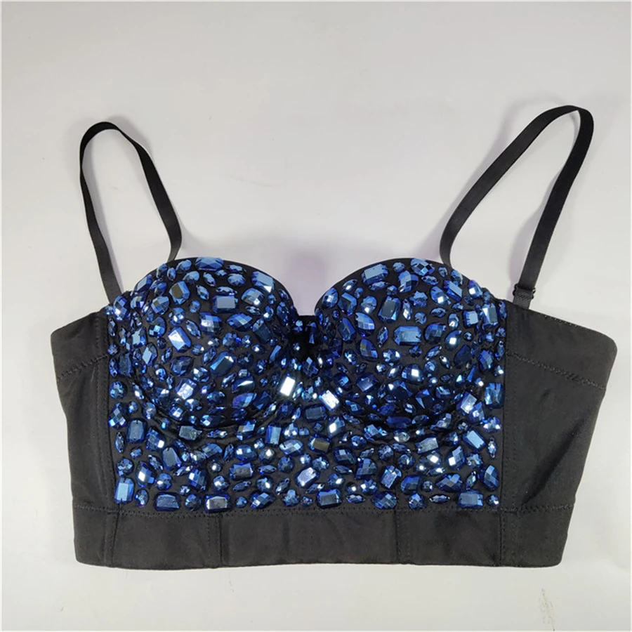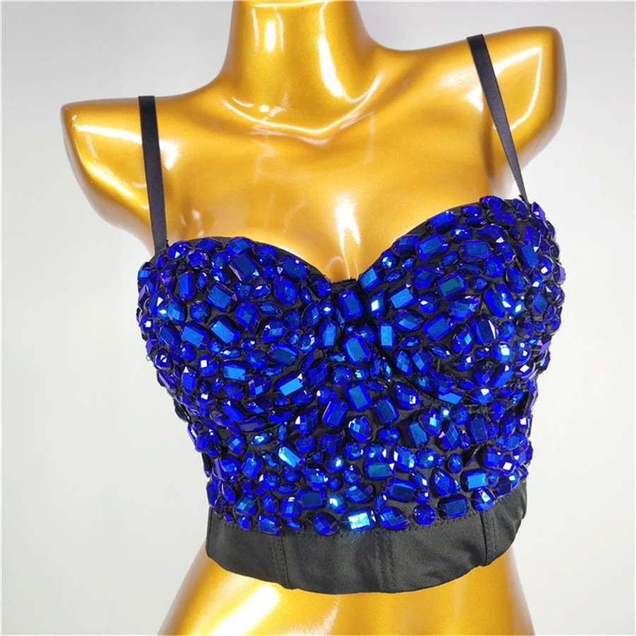Женский укороченный топ с бюстгальтером, синяя акриловая майка со встроенным бюстгальтером, сексуальный корсет для ночного клуба, Яркий укороченный топ с эффектом пуш-ап на груди