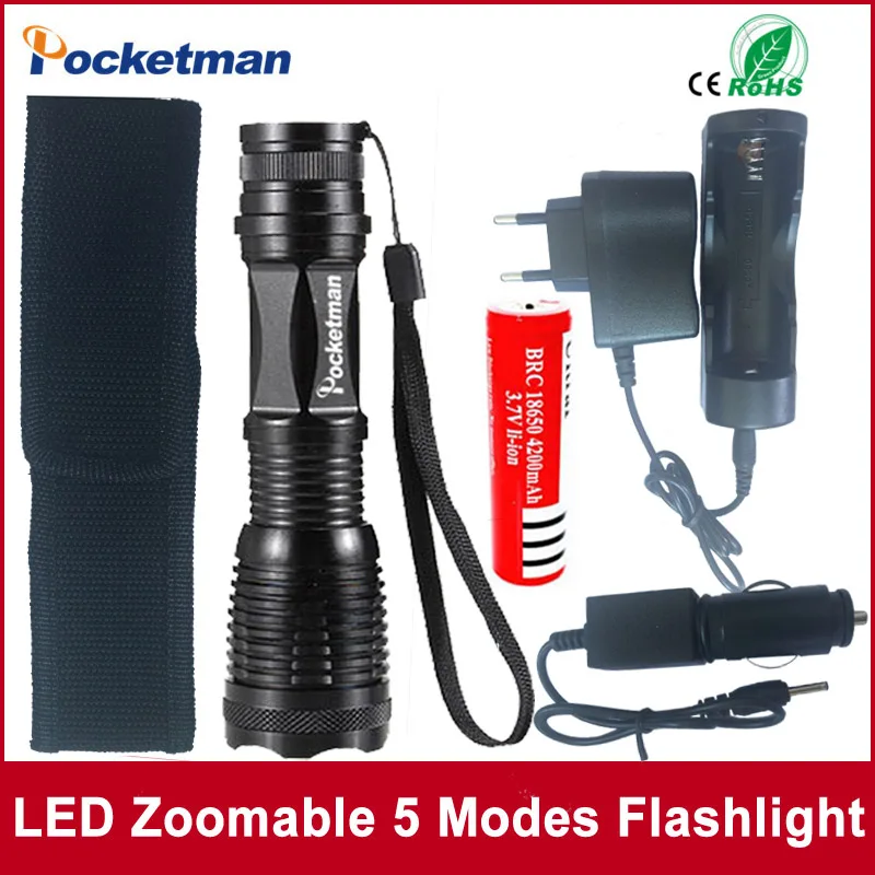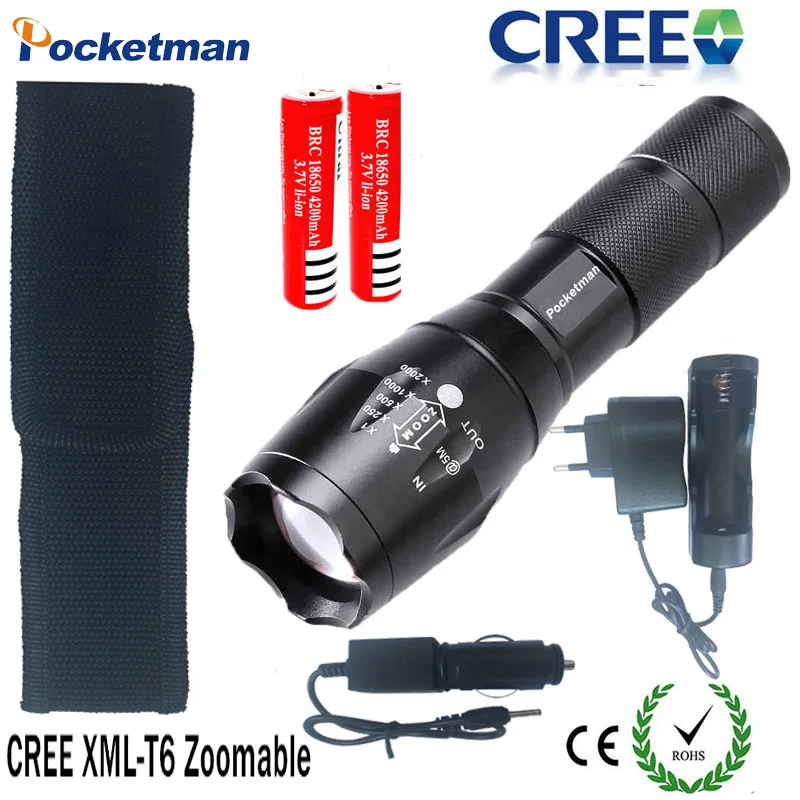 1 комплект, XML-T6, 3 лм, регулируемый светодиодный фонарик, светодиодный фонарь, автомобильное зарядное устройство + 2*18650 перезаряжаемая батарея + чехол-Кобура USD 13,21/Комплект
