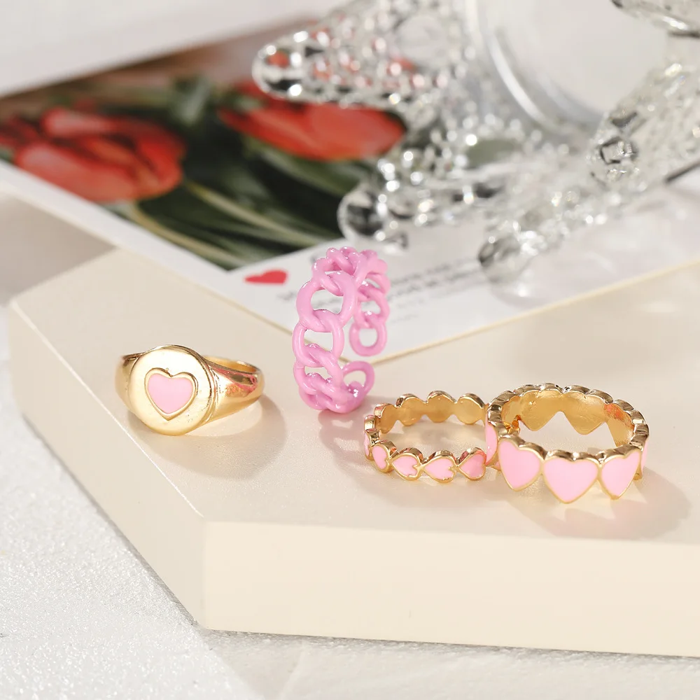 Набор женских колец с эмалью в виде РОЗОВОГО СЕРДЦА, 4 шт.компл.