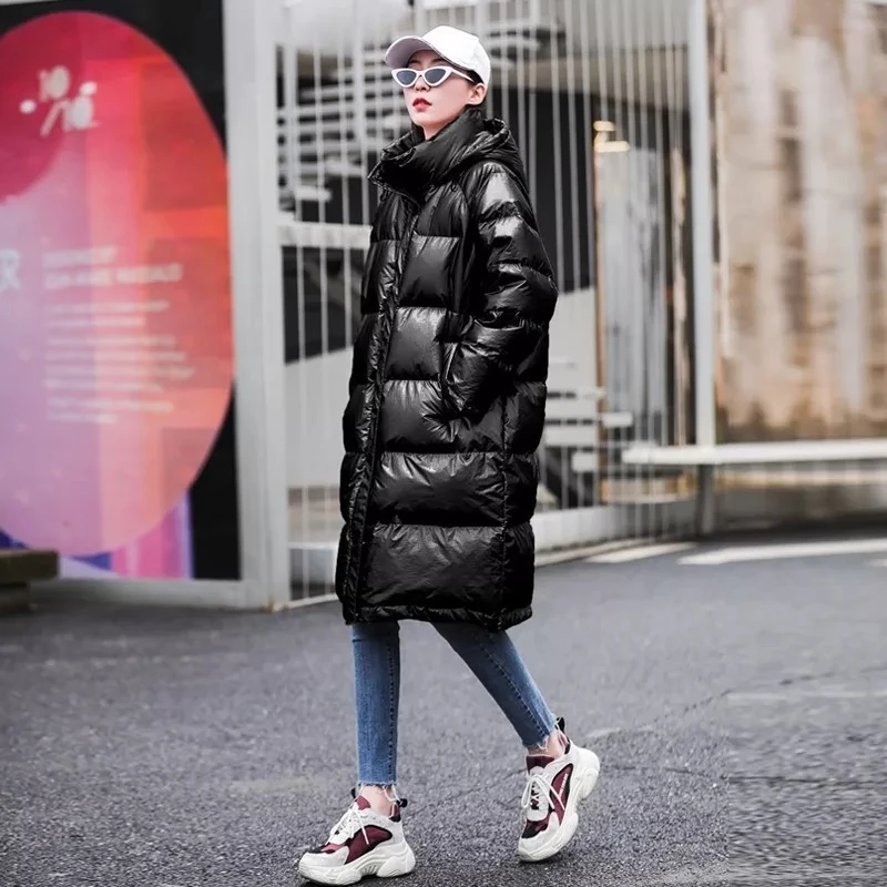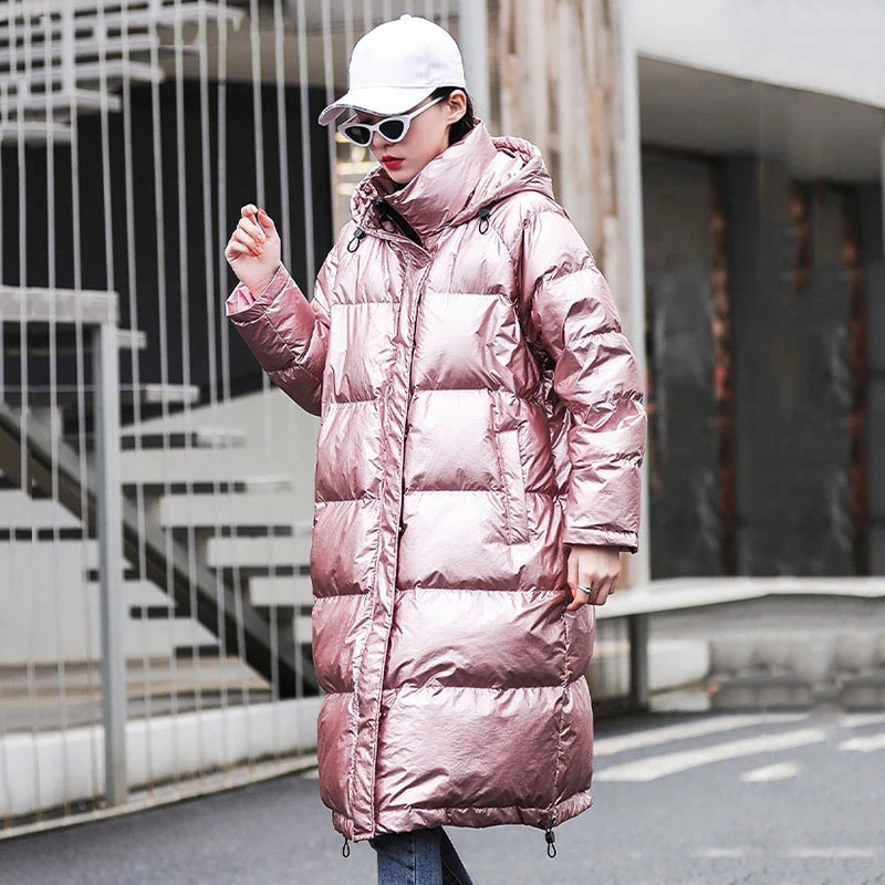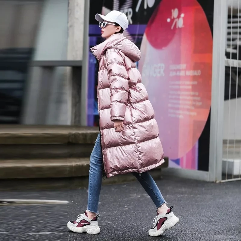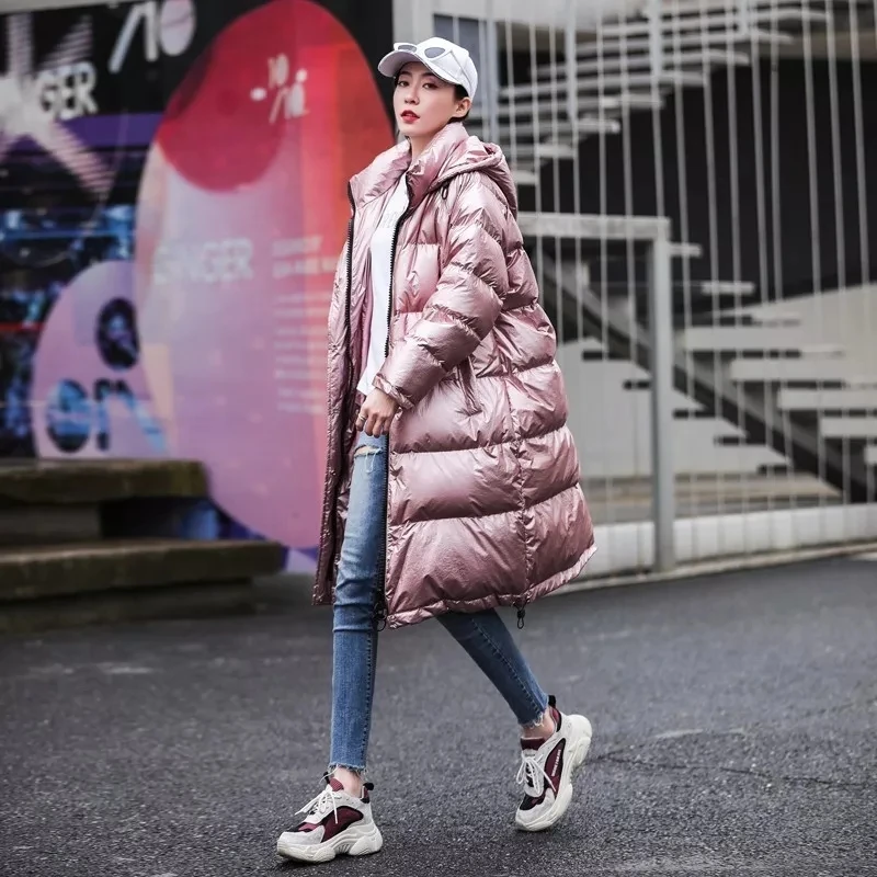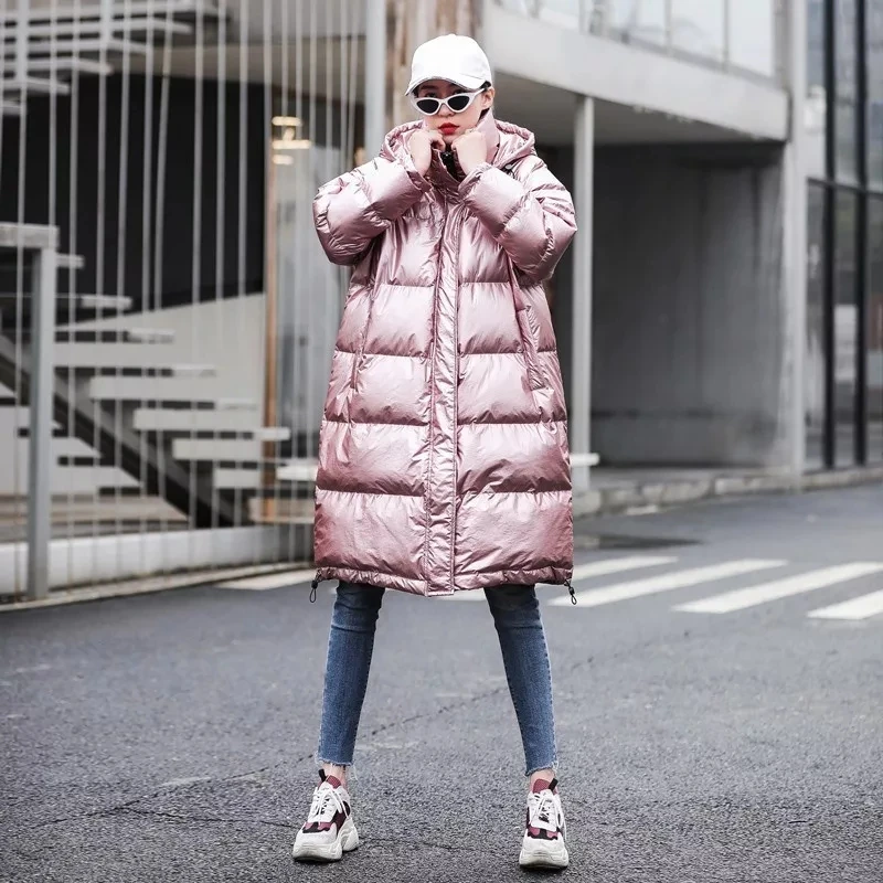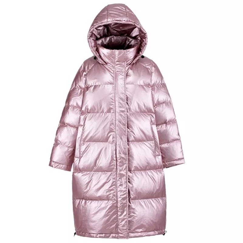 Модная розовая Глянцевая парка на подкладке 2021, Длинная зимняя теплая куртка, женское толстое свободное хлопковое пальто большого размера с капюшоном для женщин