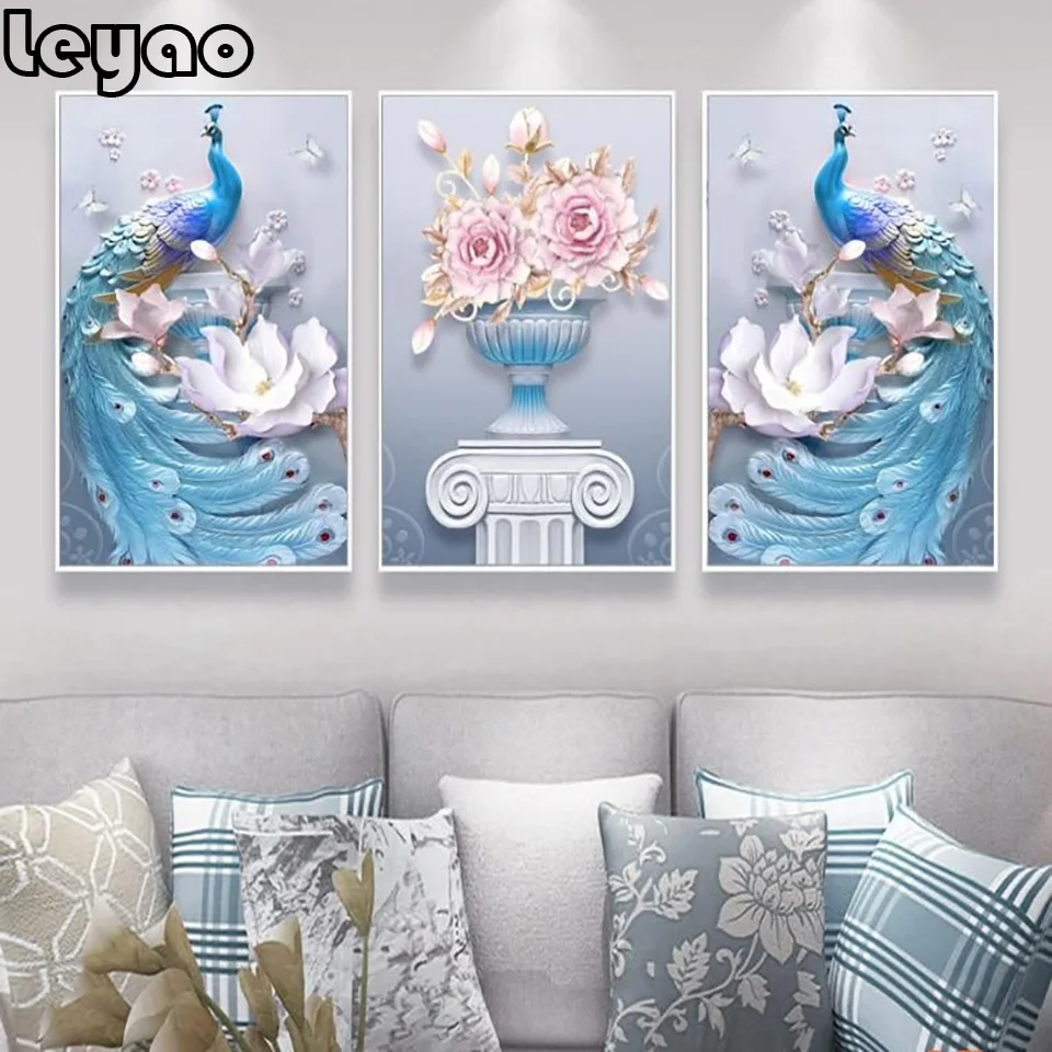 Новый западный стиль абстрактный 3 шт. трехмерная пара павлин ваза алмазная живопись Гостиная настенные художественные картины