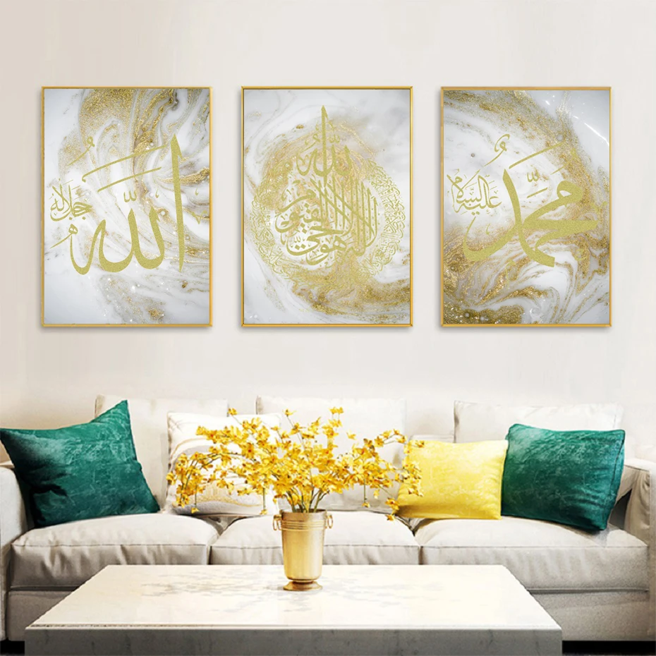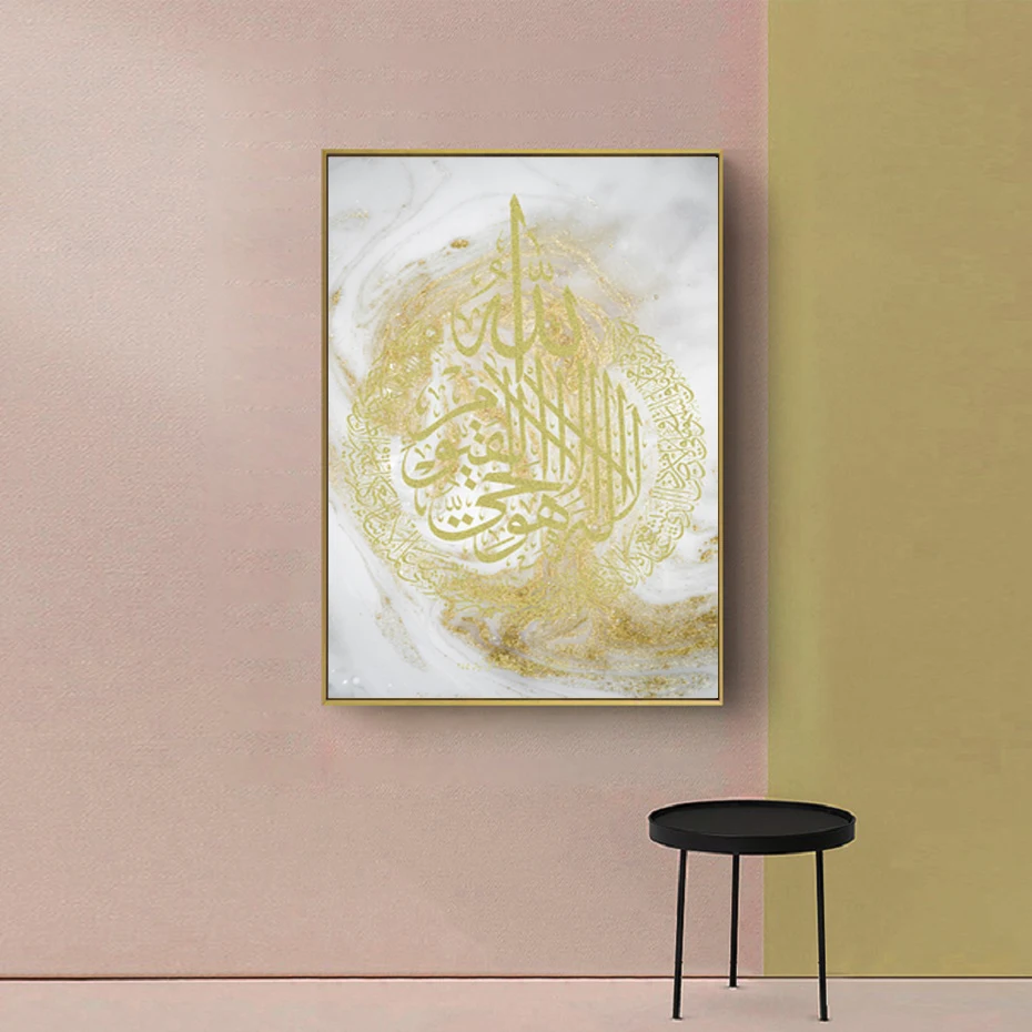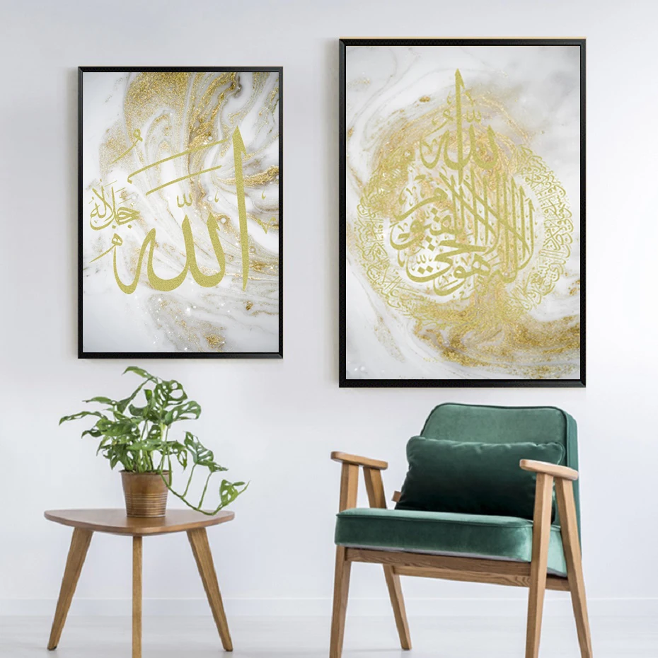 Аллах исламский Золотой Живопись стены искусства плакат позолоченный фон арабский Аль КУРСИ каллиграфия принты мусульманский гостиная домашний декор