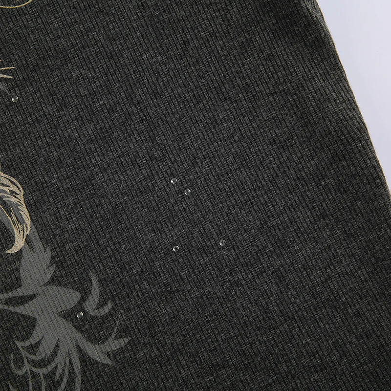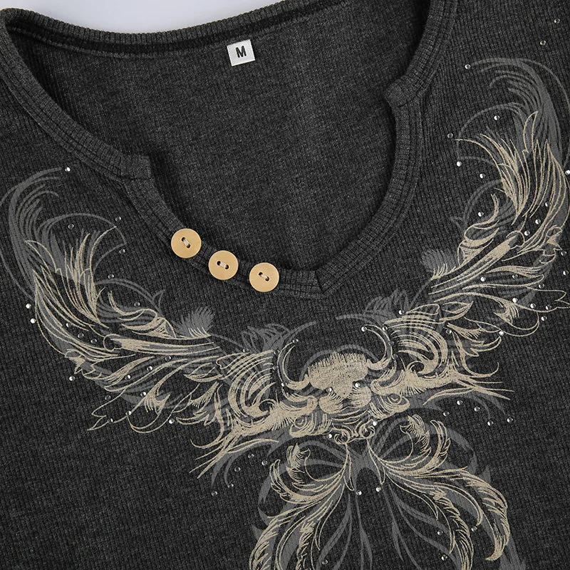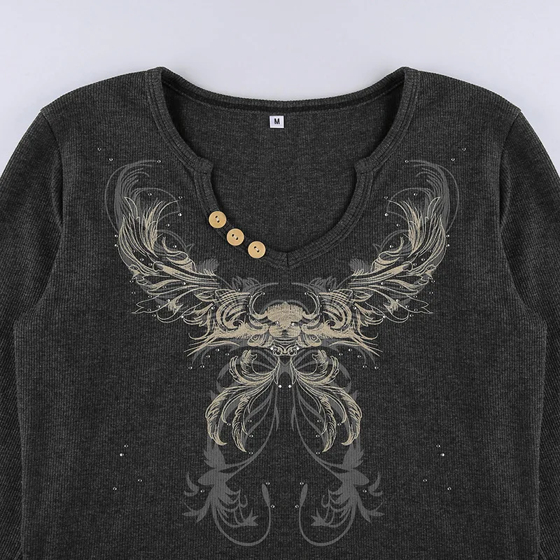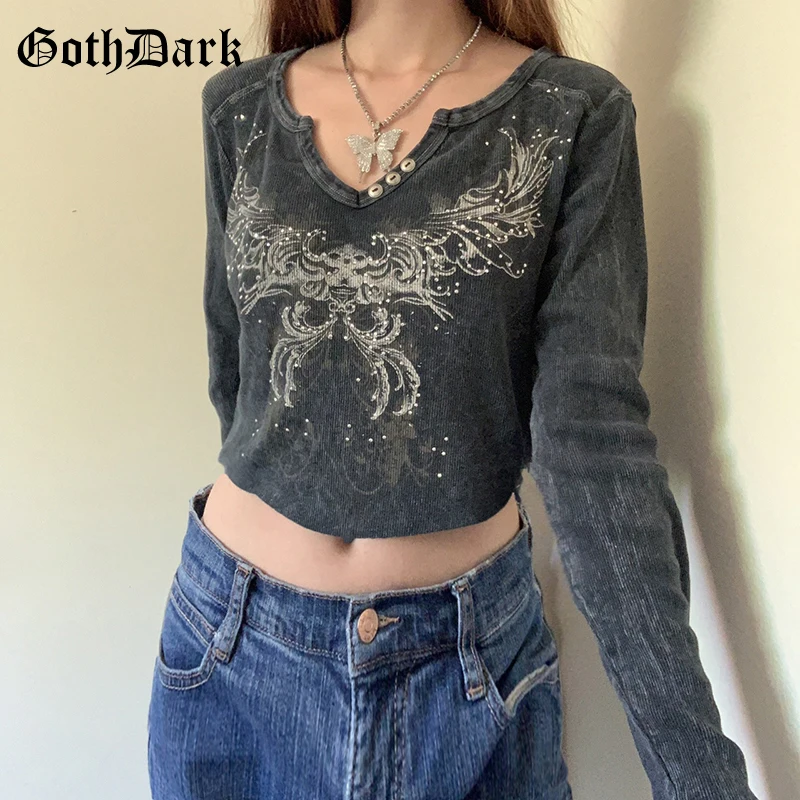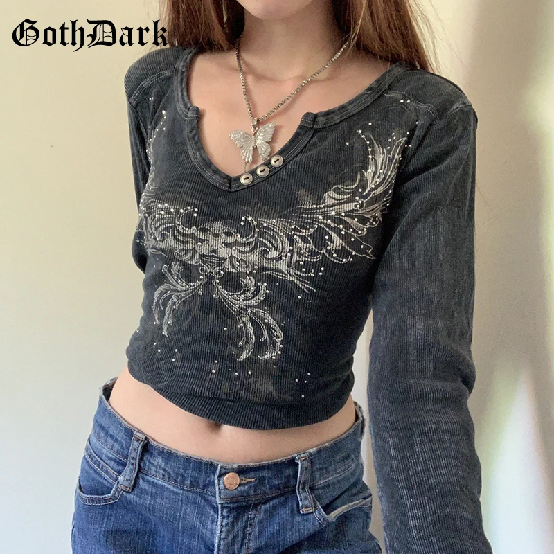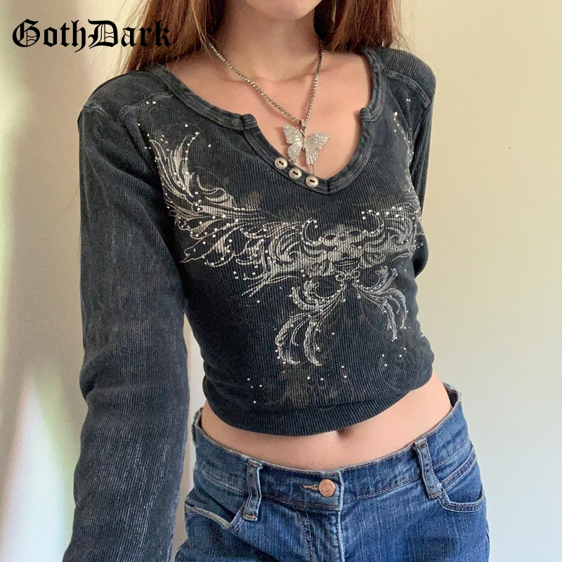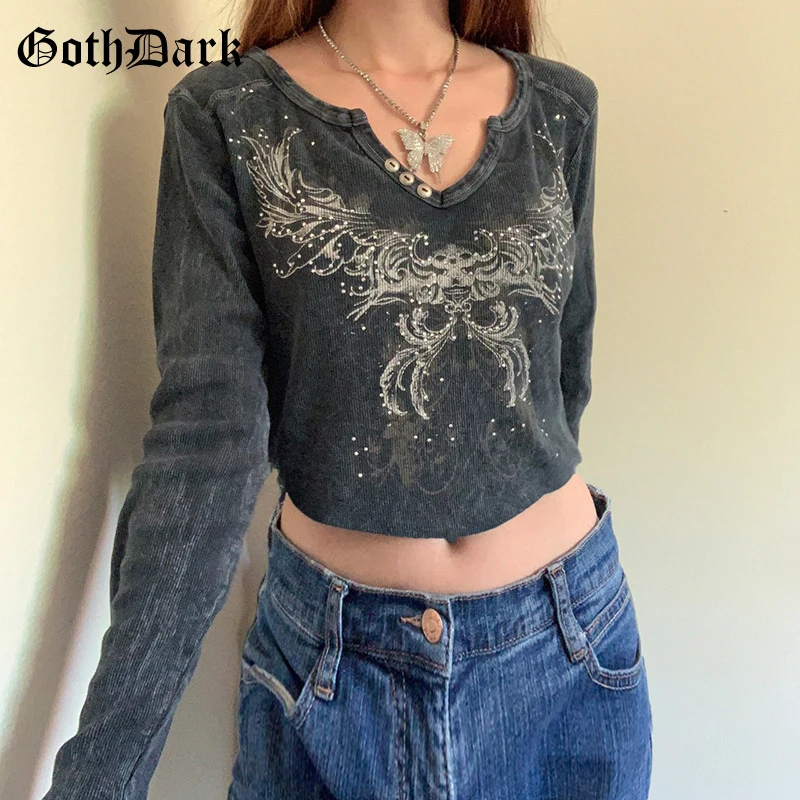Goth Dark Fairycore гранж расшитые блестками Футболки с принтом Готический винтажный ребристый Повседневный тонкий укороченный топ на осень с длинным рукавом Уличная одежда