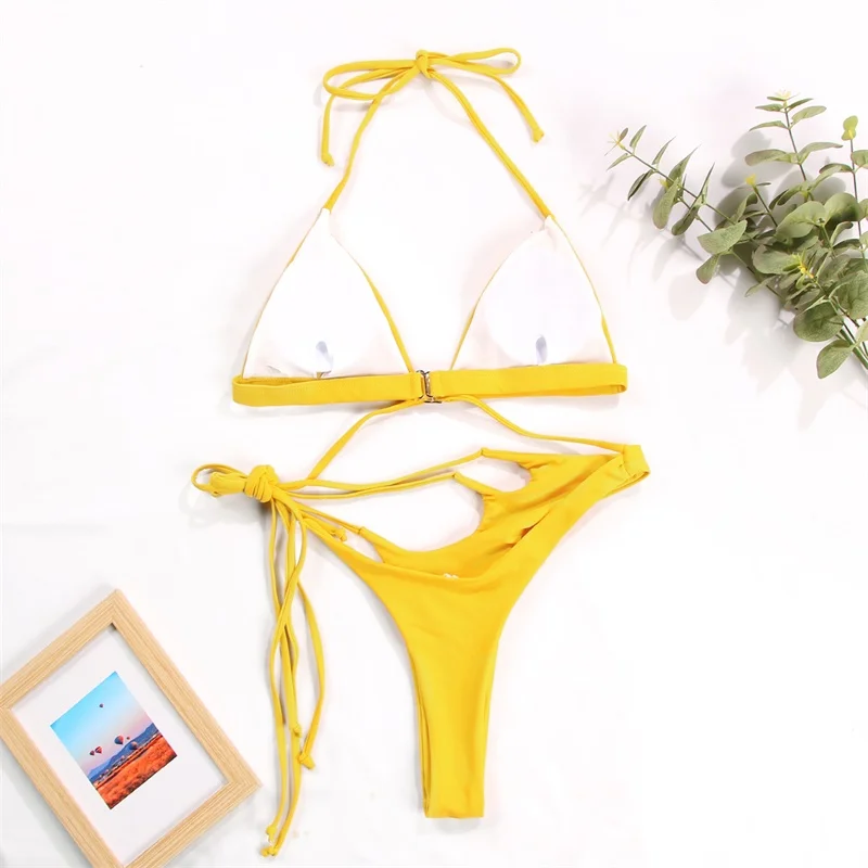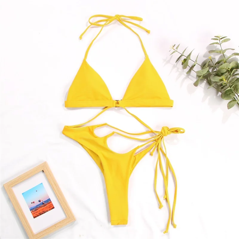 Однотонные бикини, сексуальный купальный костюм на шнуровке, женски...